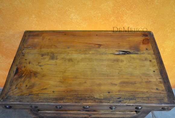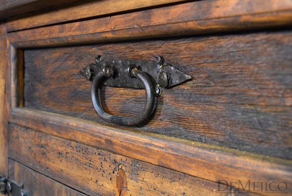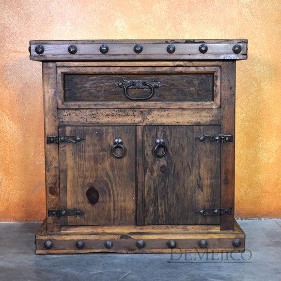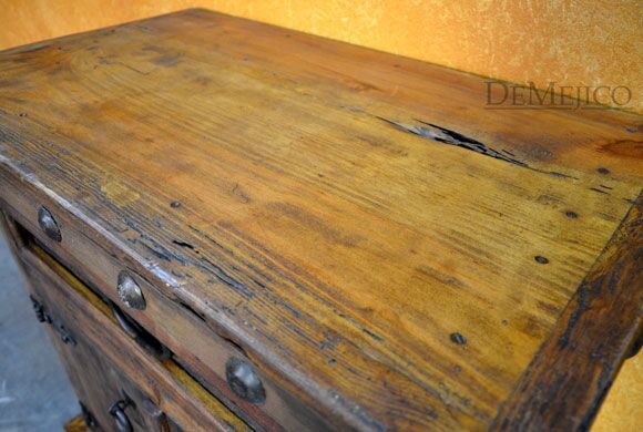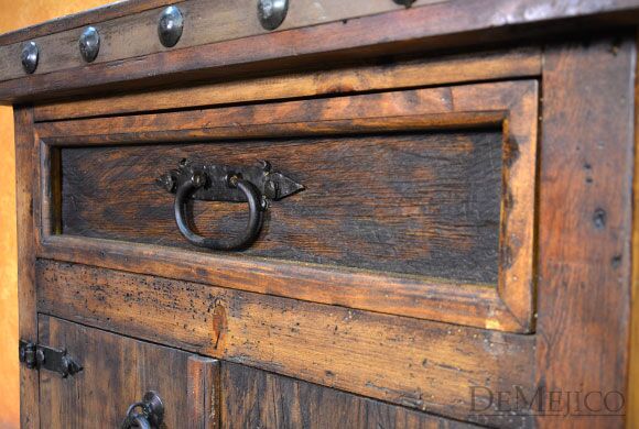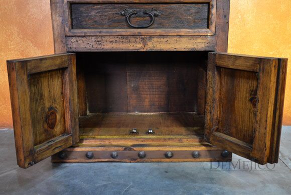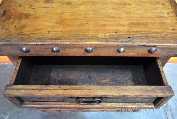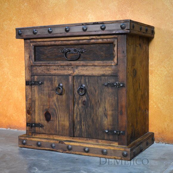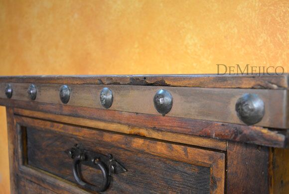 Our 2 Door Troje Nightstand is an eye-catching piece, hand crafted from solid old wood. This old wood, finished in a natural stain, beautifully showcases natural knots, stretches, and grooves throughout the entirety of the piece. Finished off with hand pounded clavos along the top and bottom banding along with hand forged iron hardware, this Old World Nightstand exhibits a true representation of Old World Mexico.