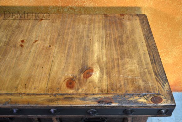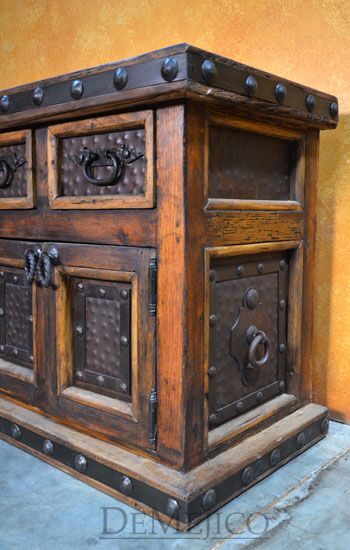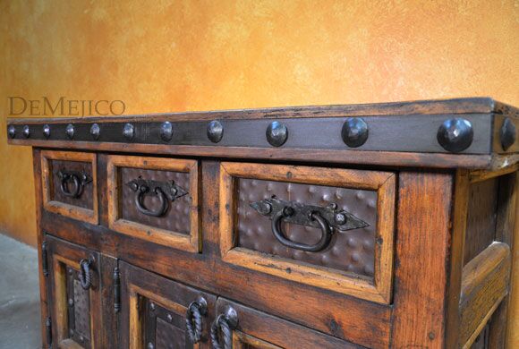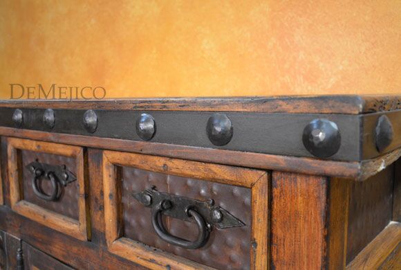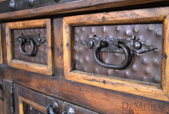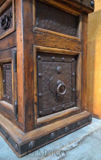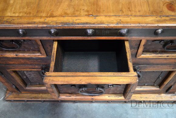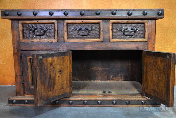 The 3 Door Antigua TV Stand is made from reclaimed wood, and features natural, rustic, Patina metal panels. With three drawers and three cabinets, this rustic entertainment center provides a great amount of space for both storage and display. Finished off with hand forged iron hardware and pounded clavos to contrast the reclaimed wood, this Spanish TV Stand represents an authentic Spanish furniture design.