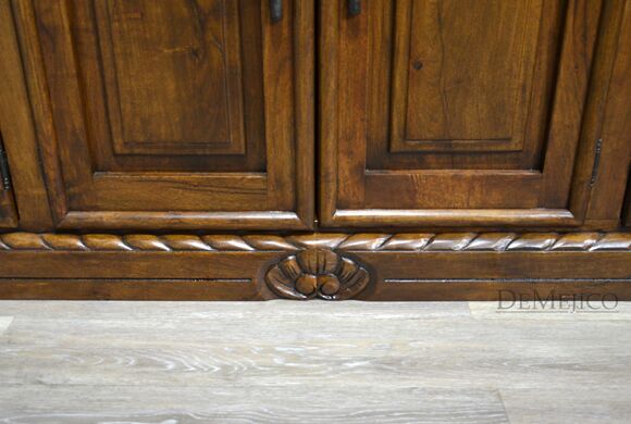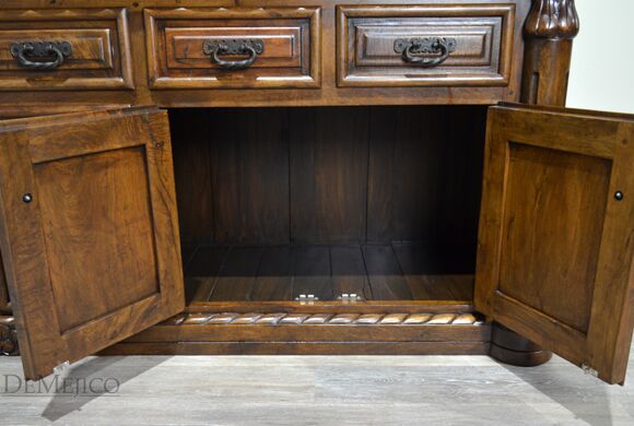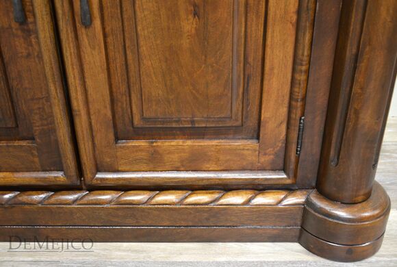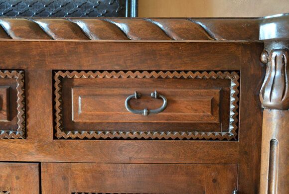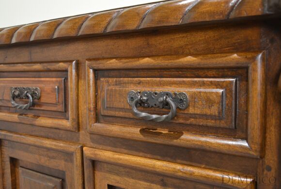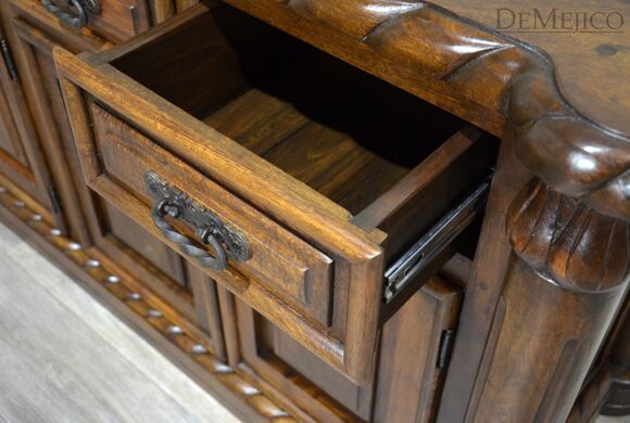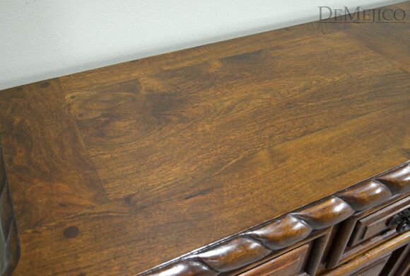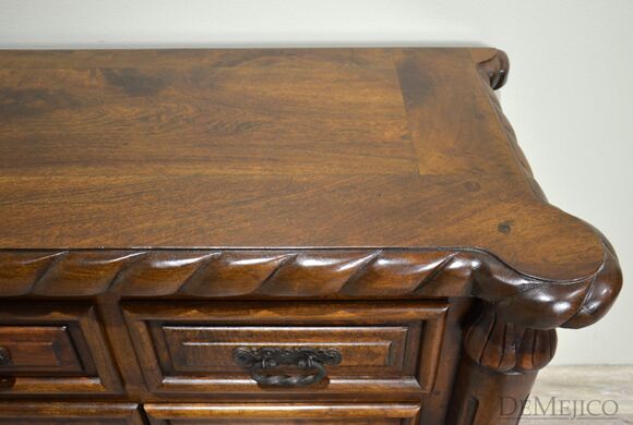 Our 9ft Concha Buffet is a beautiful sideboard featured in our Dining Catalog. Made from solid mesquite wood, this long buffet cabinet is strong and sturdy but with delicately styled details, encompassing elegant Spanish design. The twisted rope along the top and bottom, paired with raised panel drawers and cabinets provide a formal design, fitting for any style space. Six drawers and cabinets, along with a long, smooth top finish off this piece to provide much room for storage and display. Add the 9ft Concha Buffet (or size it to your dimensions) as a gorgeous accent piece for any large, casual or formal dining space.