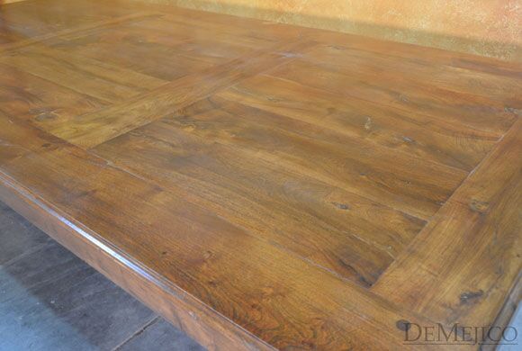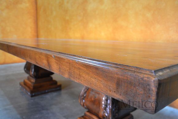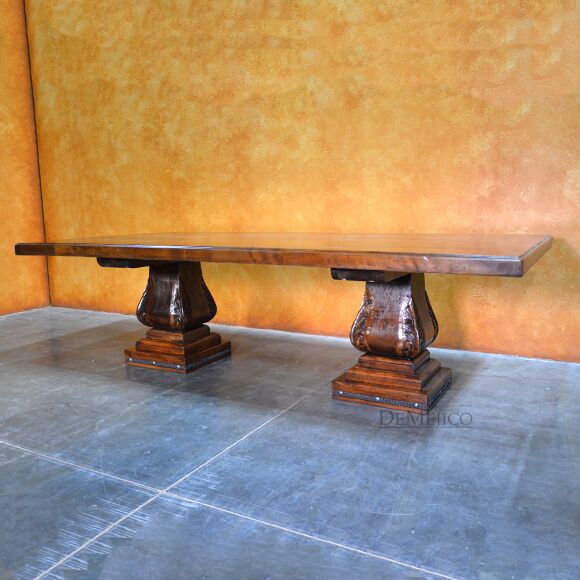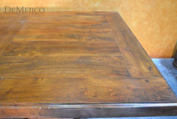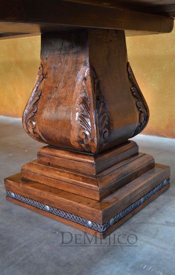 The 9ft Mesa Hoja is a Spanish Style Dining Table featured in our Dining Table Catalog. The tabletop of the Mesa Hoja is a large piece of solid mesquite wood that is eye-catchingly beautiful. Paired with this top, two teardrop style bases take inspiration from our classic “Gitana” style. Hand carved from mesquite, and accented with woven iron straps and hand pounded iron clavos, these bases are sure not to compete with the table’s top.