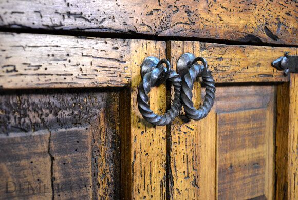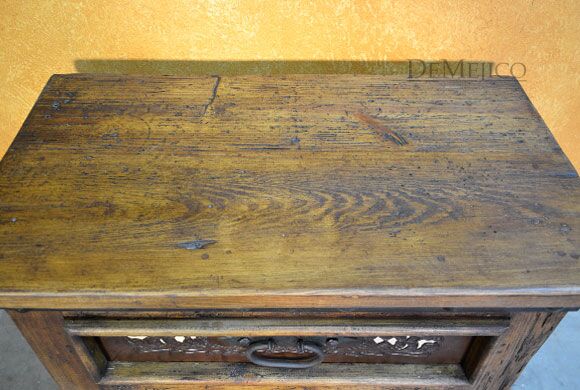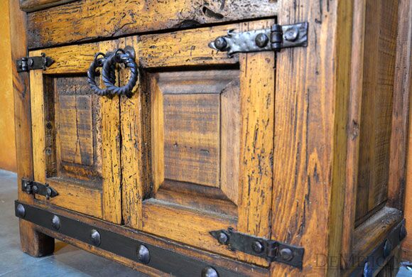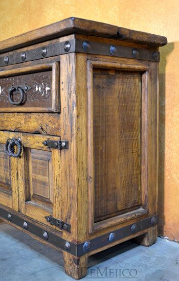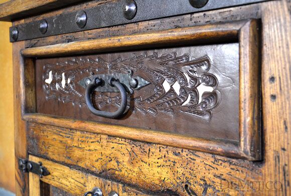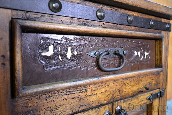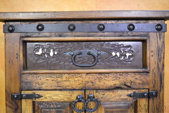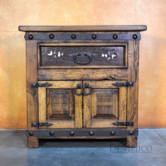 The Alamo Cincel Nightstand is a freshly designed tooled leather nightstand, featured in our Bedroom Catalog. Made from solid old wood, this nightstand is finished in a light stain, allowing the natural knots, stretches, and wood movements to show through. Complementing this stain, beautiful light and dark tooled leather designs have been added to the paneling of the single drawer of this piece. Finishing off the Alamo Cincel Nightstand, small, hand pounded iron clavos have been added around the top and bottom edge.