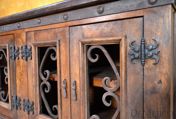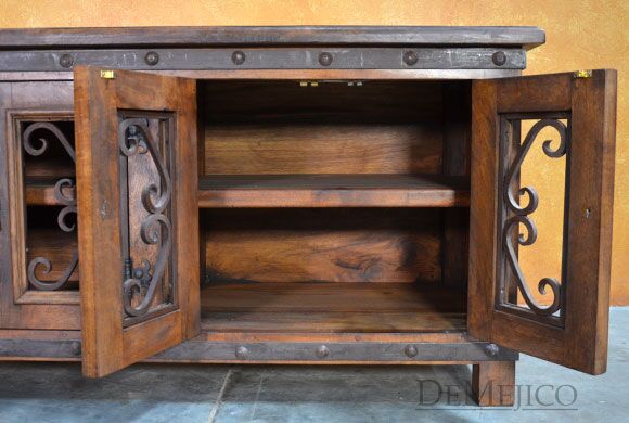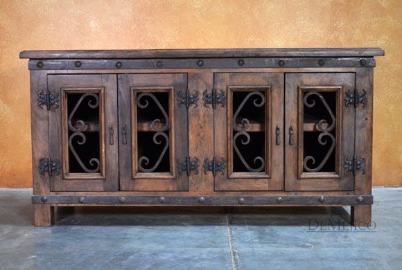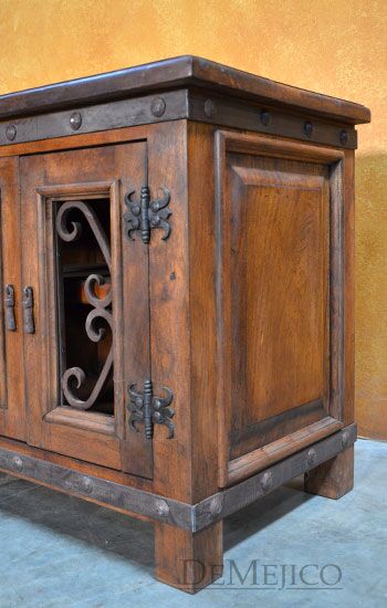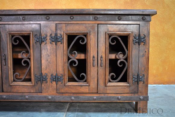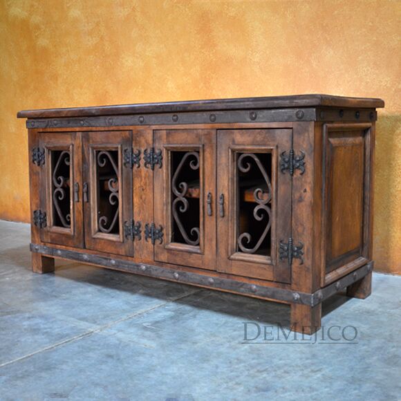 The Alamo Mesquite TV Stand is one of our most popular TV stands to date. This small Alamo style TV stand is carefully crafted from solid aged mesquite wood, and features hand-forged wrought iron accents and hardware. This mesquite TV stand has four cabinet doors with two large shelves inside, providing enough storage space for your movies, cds, or any other entertainment accessories.