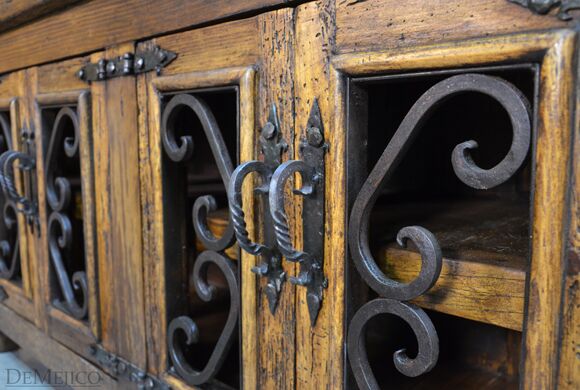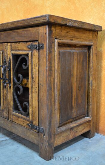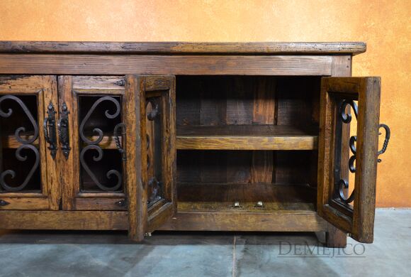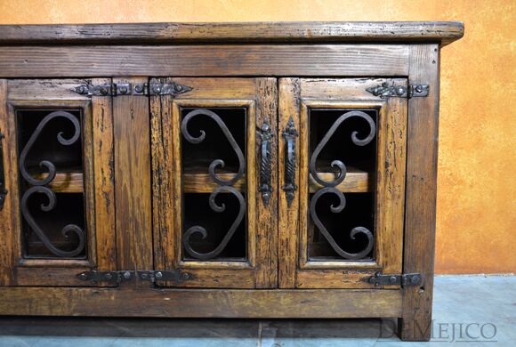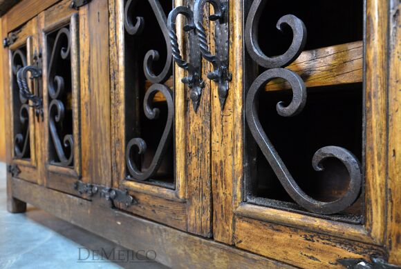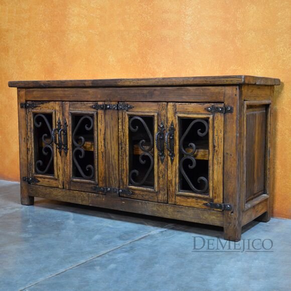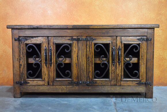 The Old Wood Alamo TV Stand is one of our most popular TV stands to date. This small Alamo style TV stand is carefully crafted from reclaimed wood, and features hand-forged wrought iron accents and hardware. This old wood TV stand has four cabinet doors with two large shelves inside, providing enough storage space for your movies, cds, or any other entertainment accessories. Accented by intricate hand forged iron scrollwork and iron straps, the Old Wood Alamo TV Stand is a perfect addition to any Spanish style living or entertainment space.