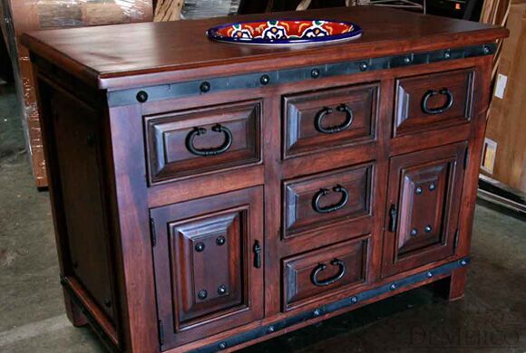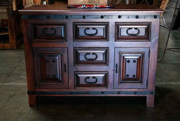 The Alamo Vanity 48″ is a classic, Alamo style, rustic vanity featured in our Vanity Catalog. Made from solid mesquite wood, and complete with a dark stain and smooth finish, this vanity brings out the natural knots and stretches of the wood. With solid wood cabinets, and drawers mounted on full extension ball-bearing slide rails that provide an easy, quiet open-and-close operation, it is both practically and beautifully designed. The unit is shown with a solid wood top, which will accept any type of sink installation. Add the Alamo Vanity 48″ to your bathroom for an elegant and classic look.