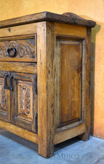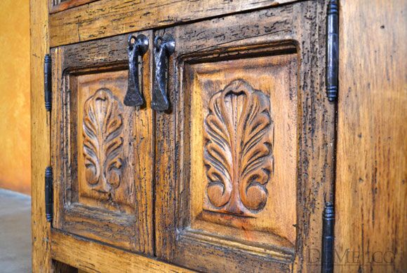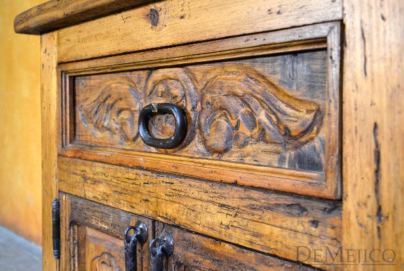 Love hand carved details? Look no further than our Ángel Nightstand. This brand new addition to our Bedroom Catalog shows off new carvings, never before seen on any of our products. Hand crafted from solid old wood, this Spanish carved nightstand features attention-grabbing elements from top to bottom. With florals, to leafing, and angel-like wings, the Ángel Nightstand’s carvings on its single drawer and double door cabinet will always give you something to admire. Accented by hand forged iron hardware pulls, raised panel sides, and added carving on the top, this nightstand classically shows off authentic, Spanish style. Looking to customize a Spanish nightstand for your space? Ask us how we can do just that!