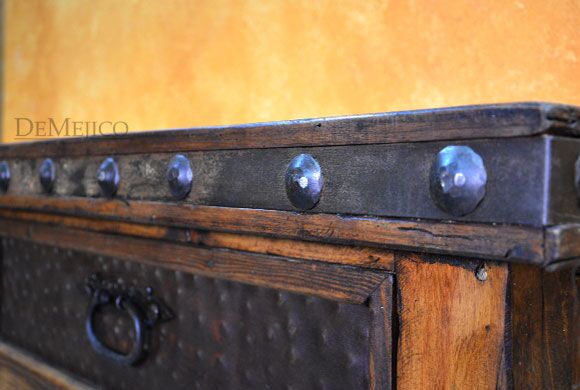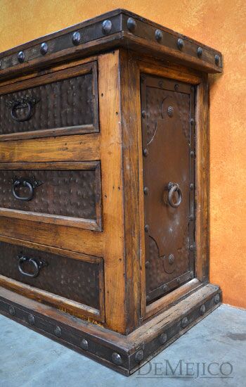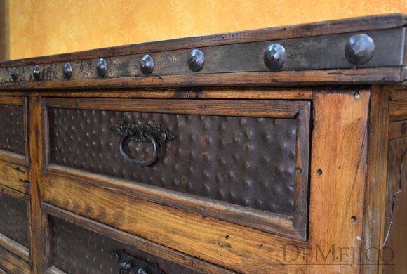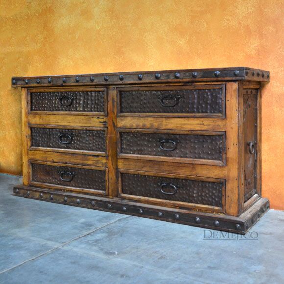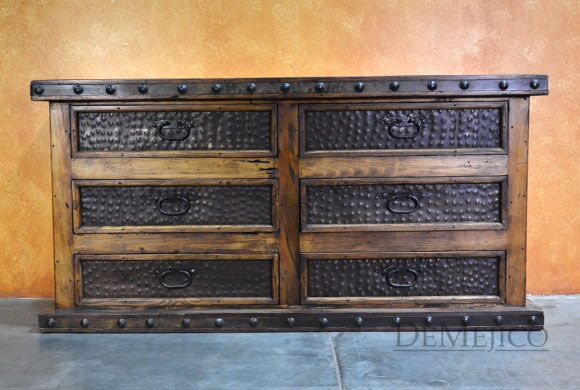 The Antigua Dresser is made from reclaimed wood, and features natural, rustic, Patina metal panels. With six drawers, this rustic dresser provides a great amount of space for storage, in your bedroom. Finished off with hand forged iron hardware and pounded clavos to contrast the reclaimed wood, this Spanish dresser represents an authentic Spanish furniture design.