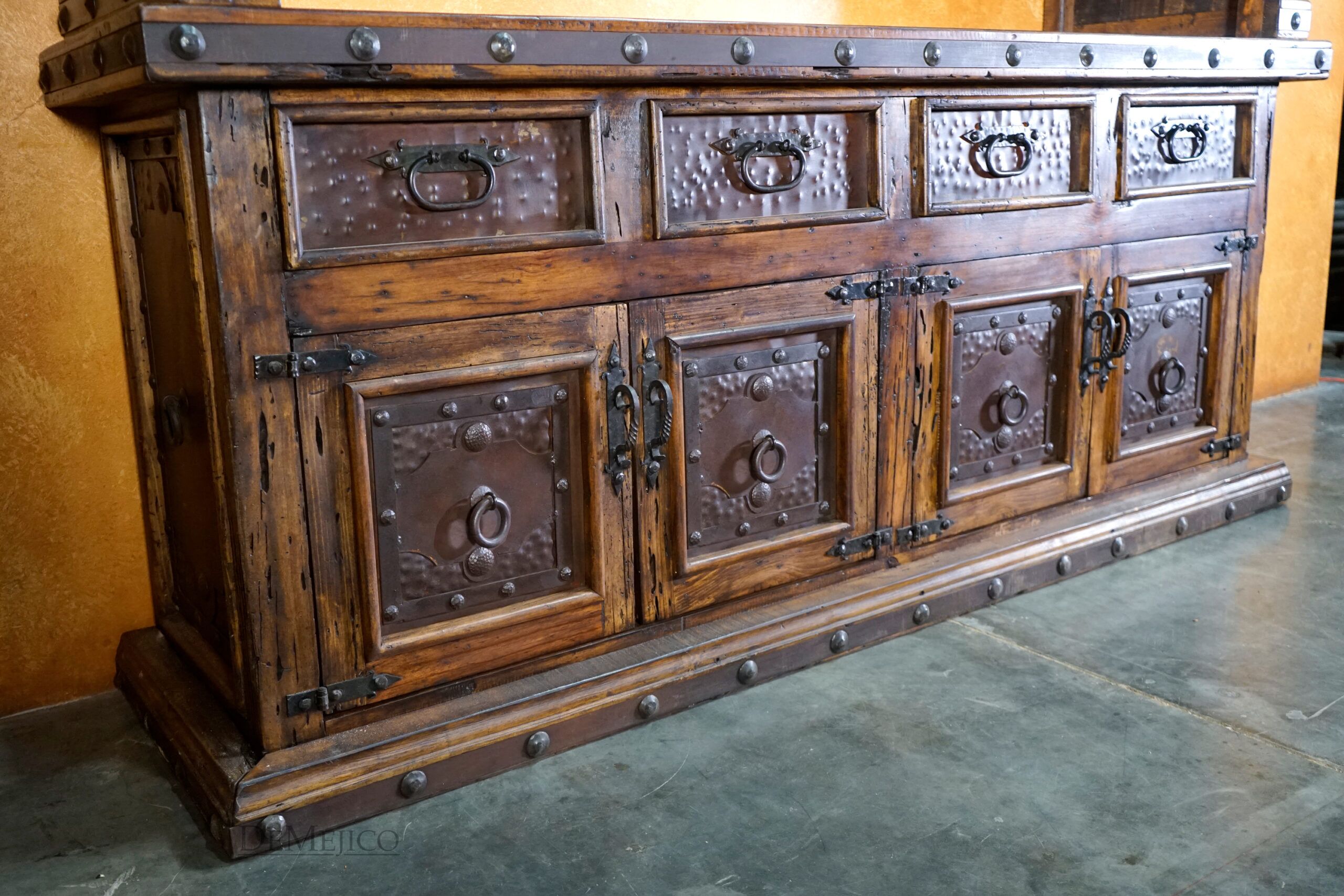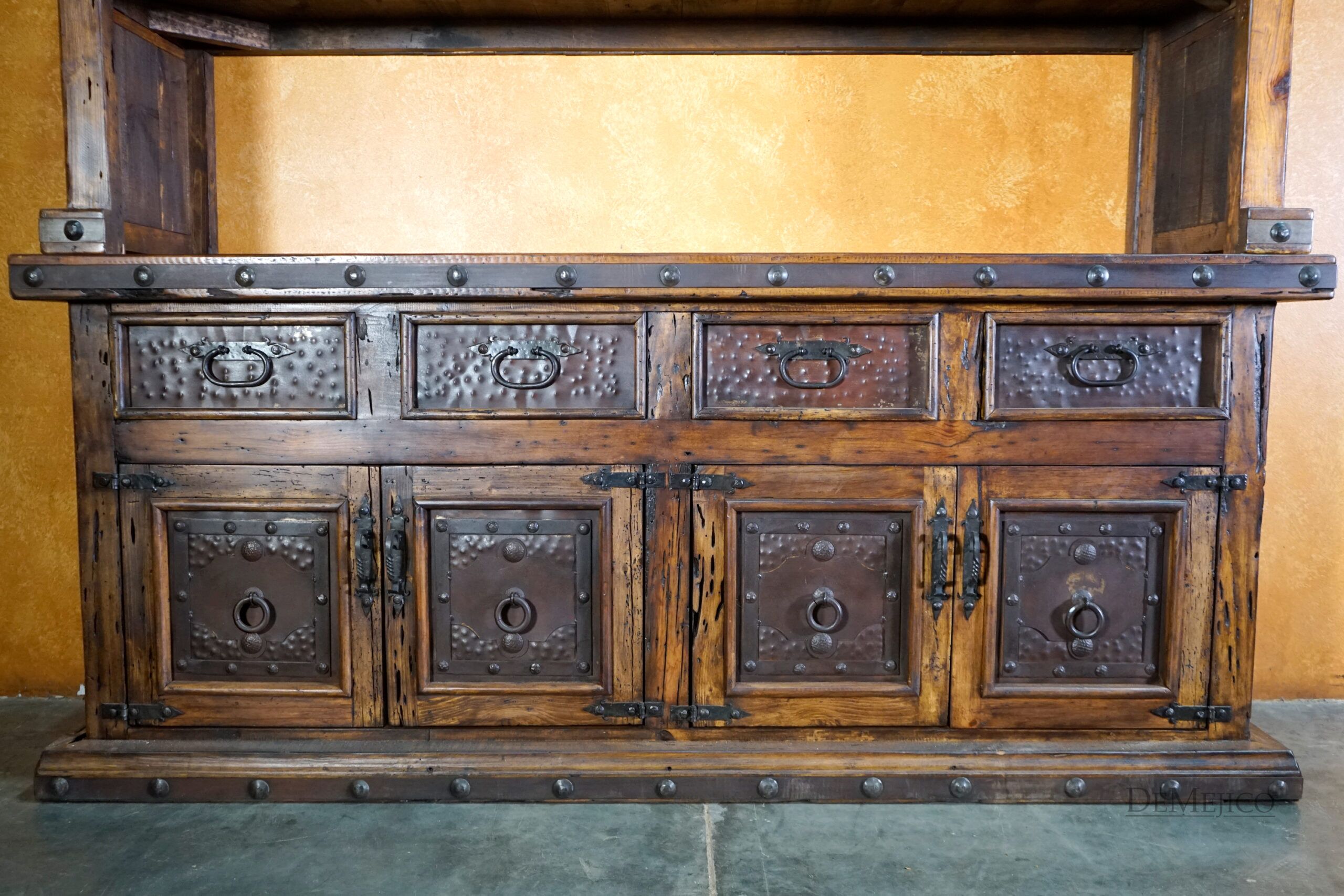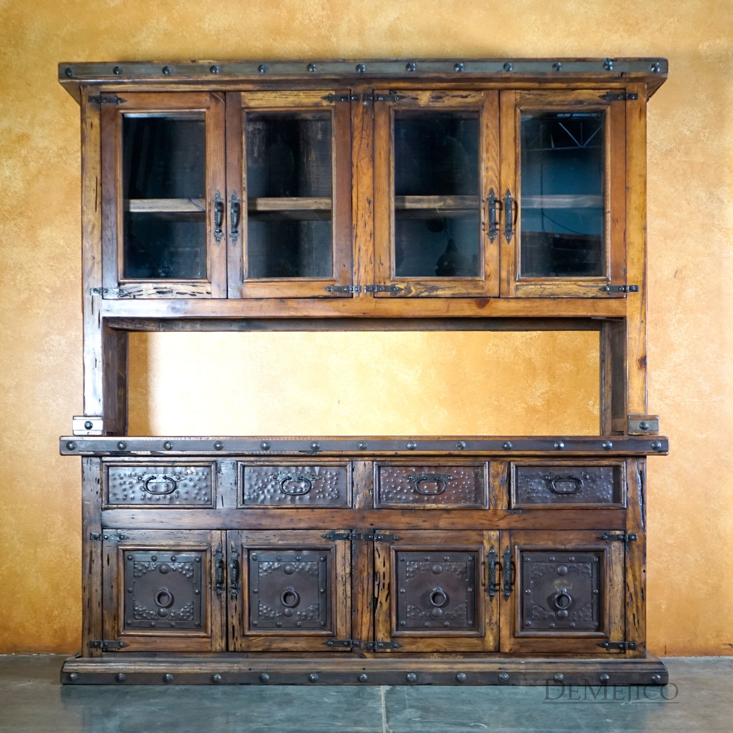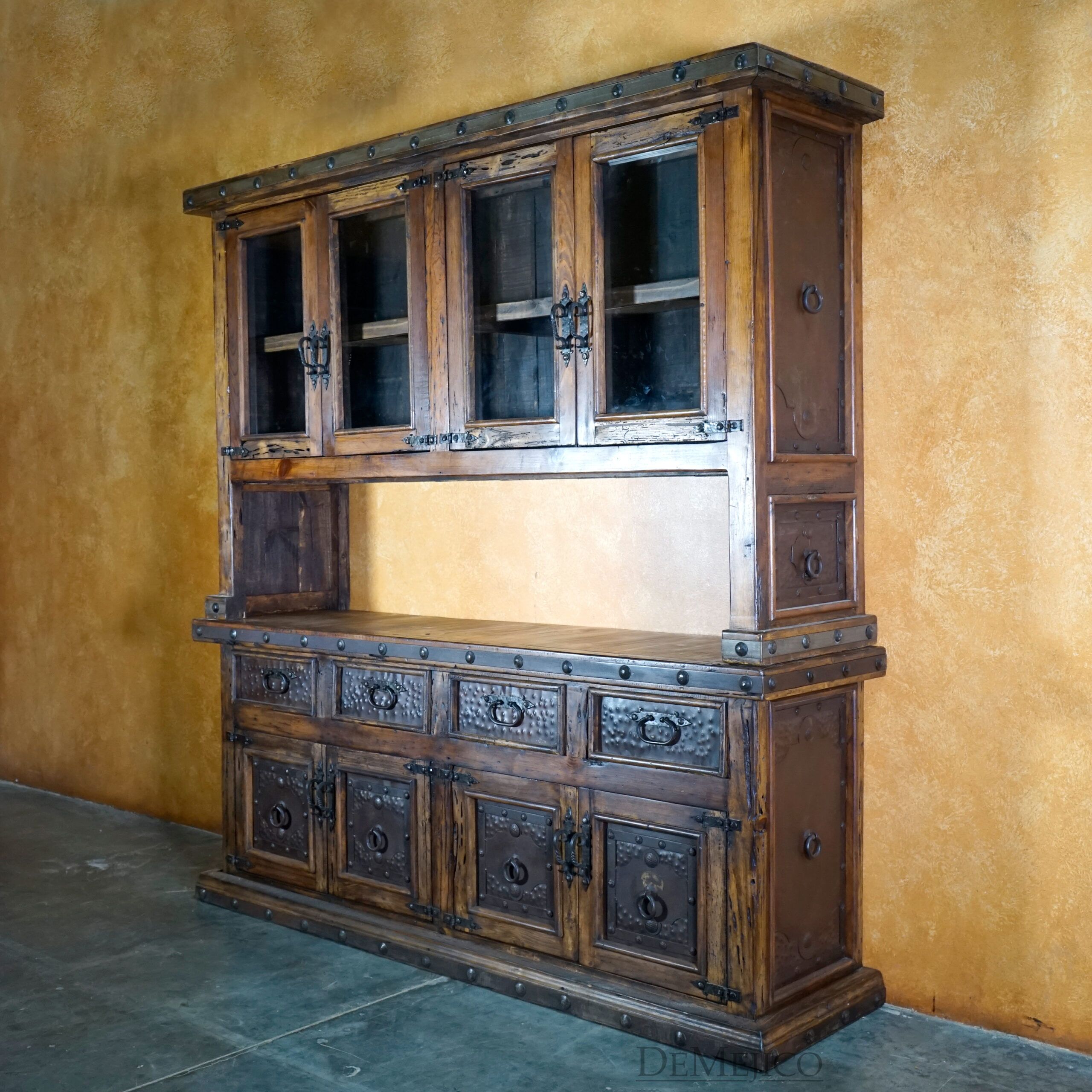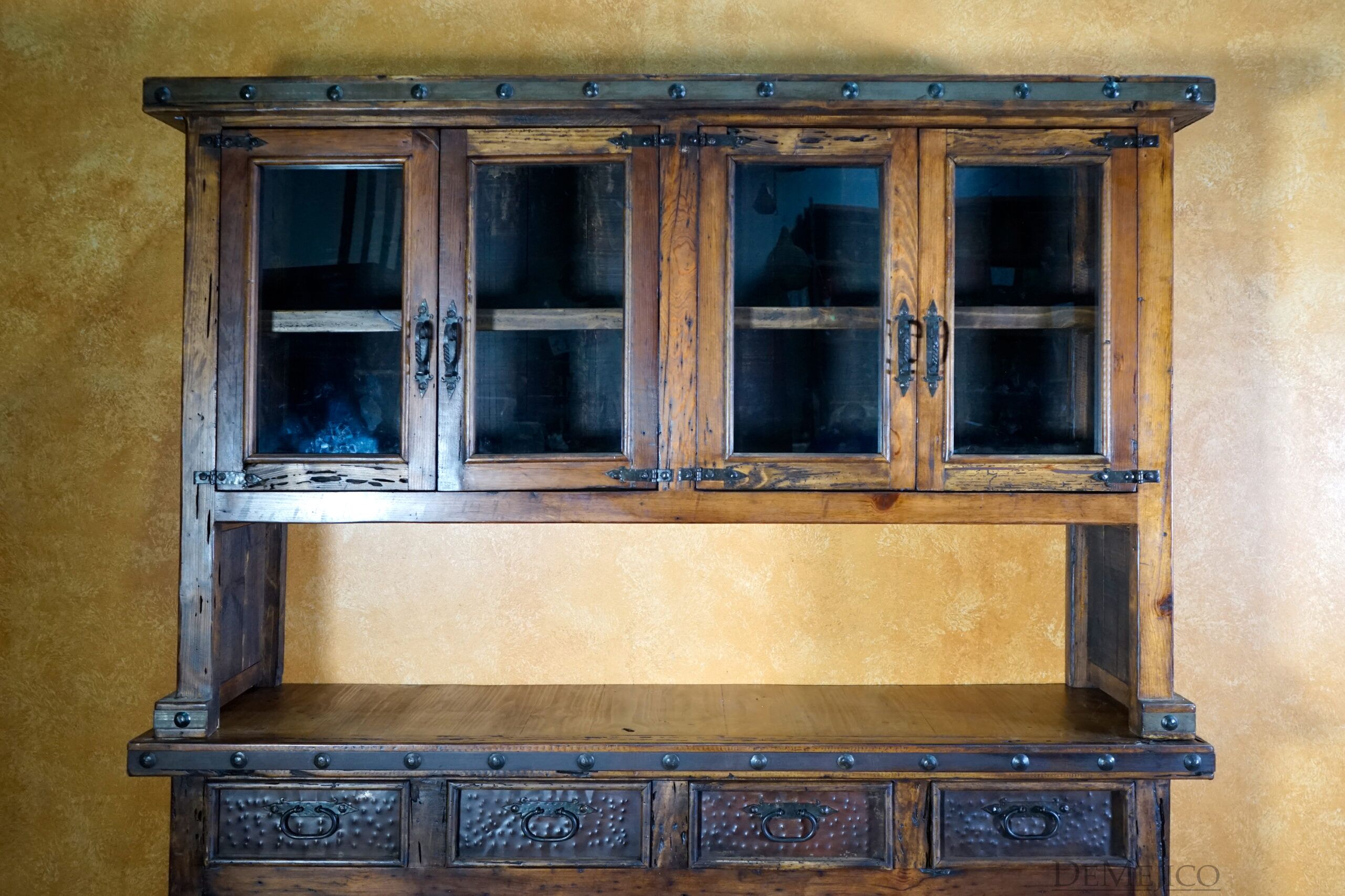 The Antigua Hutch with Glass is a grand piece, featured in our Dining Room Catalog. Handcrafted from reclaimed wood, and accented by hand forged iron hardware, this two-piece hutch features a great deal of rustic Spanish style. The top piece features shelving enclosed with glass over an open space below for storage and display. The bottom piece features four drawers and two double door cabinets, for even more storage. Each cabinet and drawer facing showcases rustic, Patina metal panels, enhancing the piece’s Spanish flair. Finished off with hand forged iron hardware and pounded clavos to contrast the metal and reclaimed wood, this rustic hutch represents an authentic Spanish furniture design. Add the Antigua Hutch with Glass to your dining space for a rustic country look.