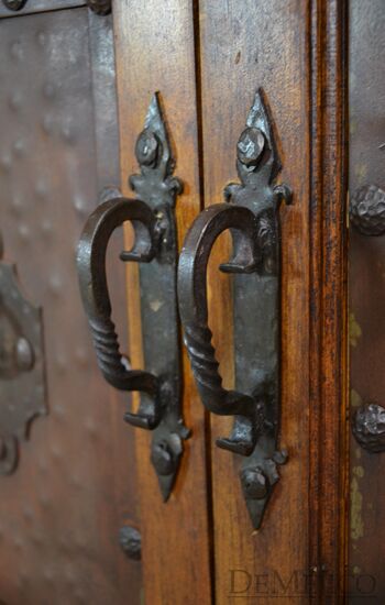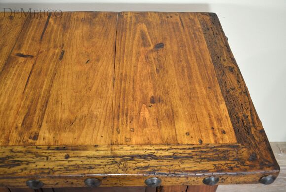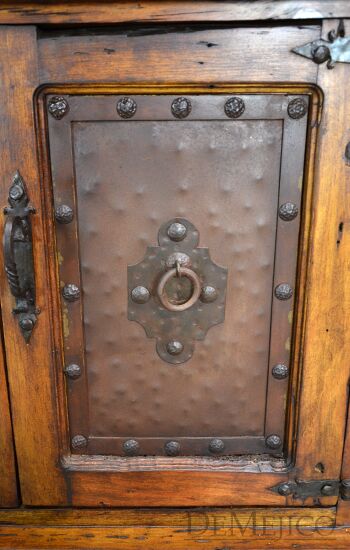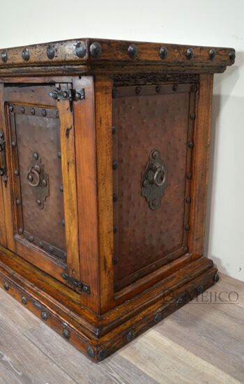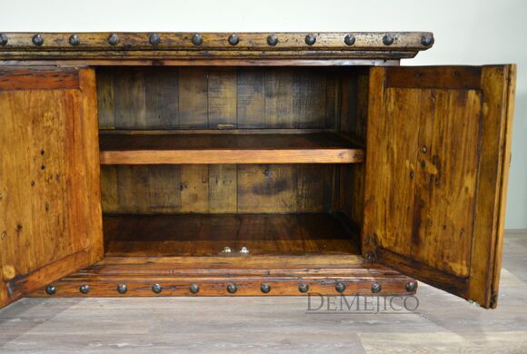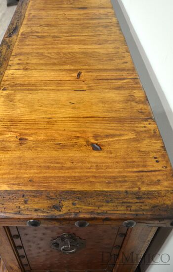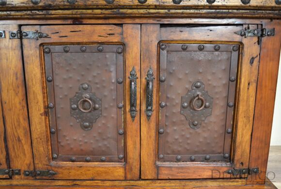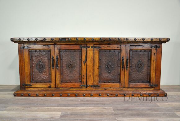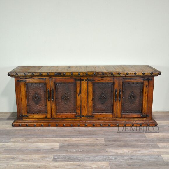 The Antigua TV Stand is a rustic entertainment center, made from reclaimed wood. Featuring a top laid in small panels, this entertainment center beautifully showcases the wood’s natural knots, stretches and movements. The four cabinets showcase unique, hand pounded copper paneling, inspired by our Buffet Antigua. Accented by hand pounded iron clavos along the top and bottom, as well as hand forged iron hardware straps and pulls, the Antigua TV Stand gives off a very rustic feel.