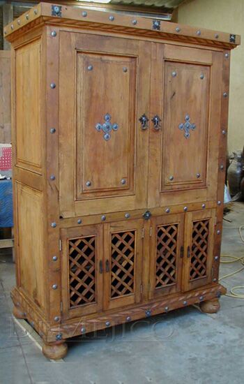 The Armario Rejas Spanish armoire is made from solid mesquite wood and finished off with a light stain. This beautiful armoire is accented by large hand pounded iron clavos, as well as an intricately carved twisted design along the top and bottom. These accents, tied together with the checkered paneling of the bottom cabinets, create an authentic Spanish feel.