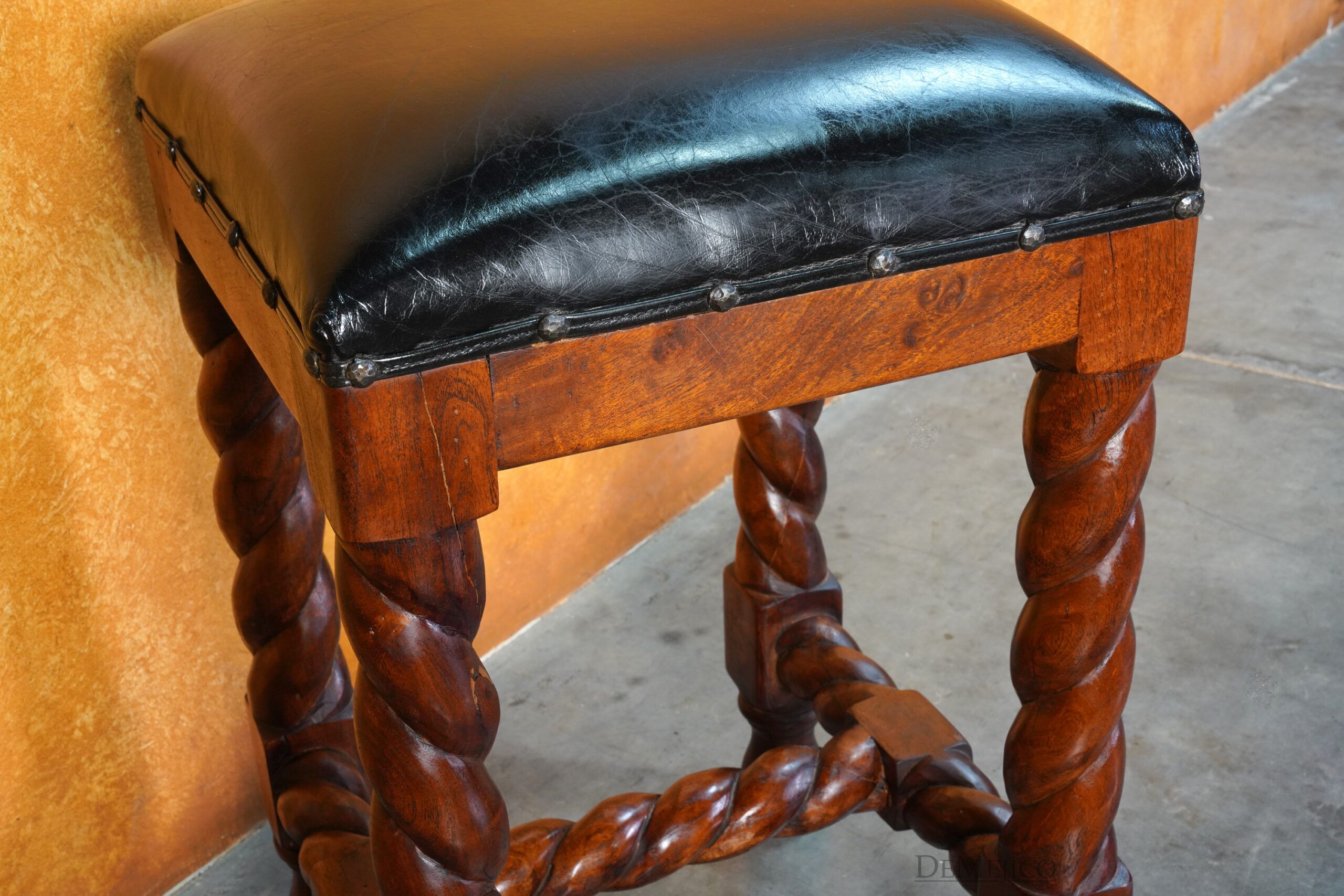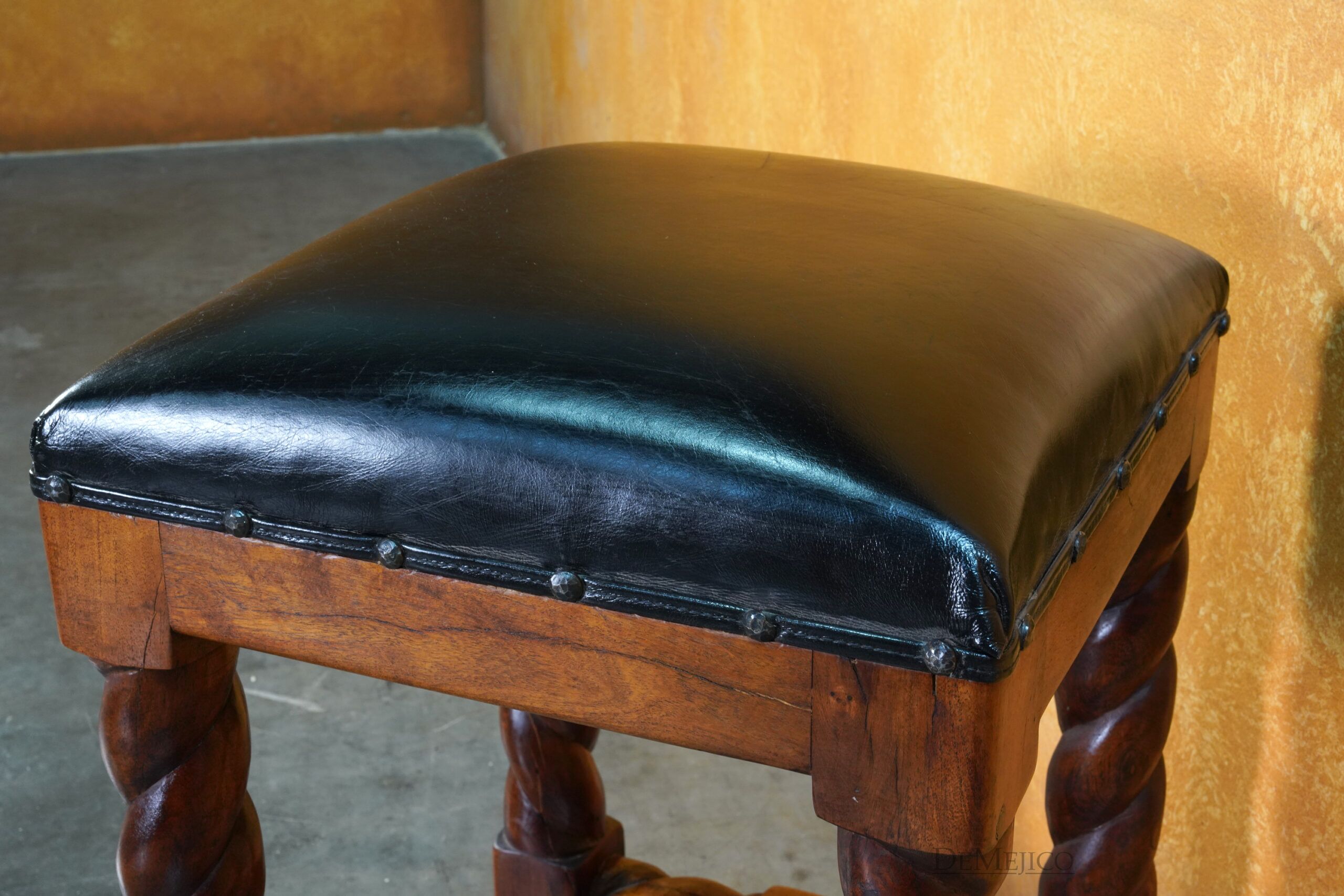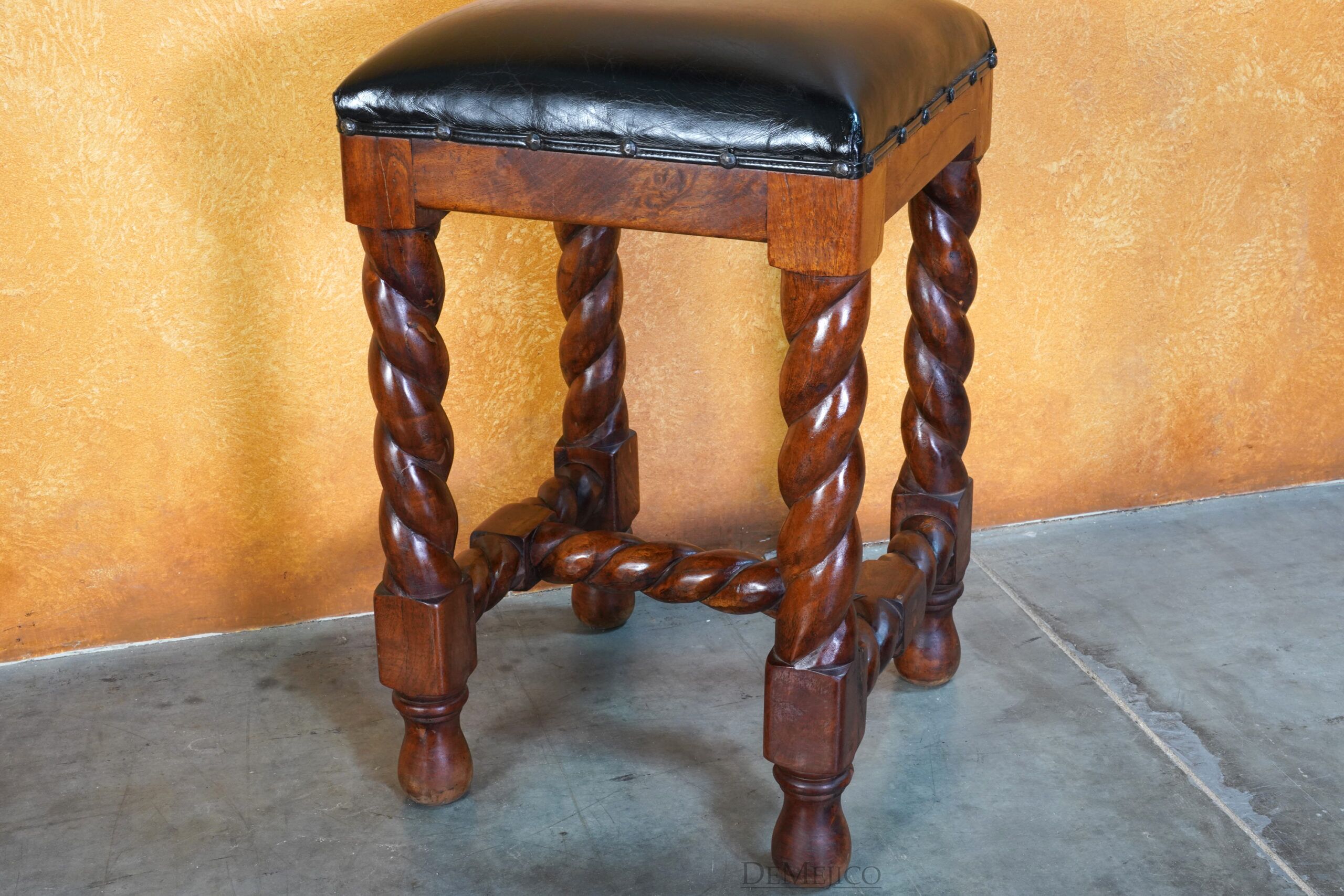 A backless Spanish bar stool featured in our Bar Catalog, the Backless Chapital Barstool shows off thick mesquite wood legs, hand carved in a twisted rope design to follow our popular “Chapital” style. Upholstered with a dark vintage leather and hand pounded iron clavos around the seat’s edge, the Backless Chapital Barstool has the perfect amount of Spanish style. Add this Spanish counterstool to your bar, restaurant, or dining space for a classic and elegant Spanish touch.