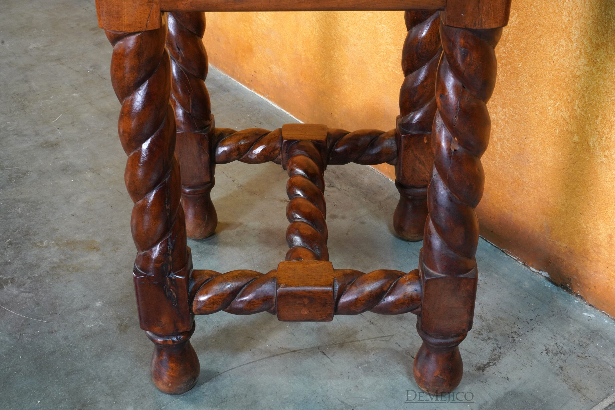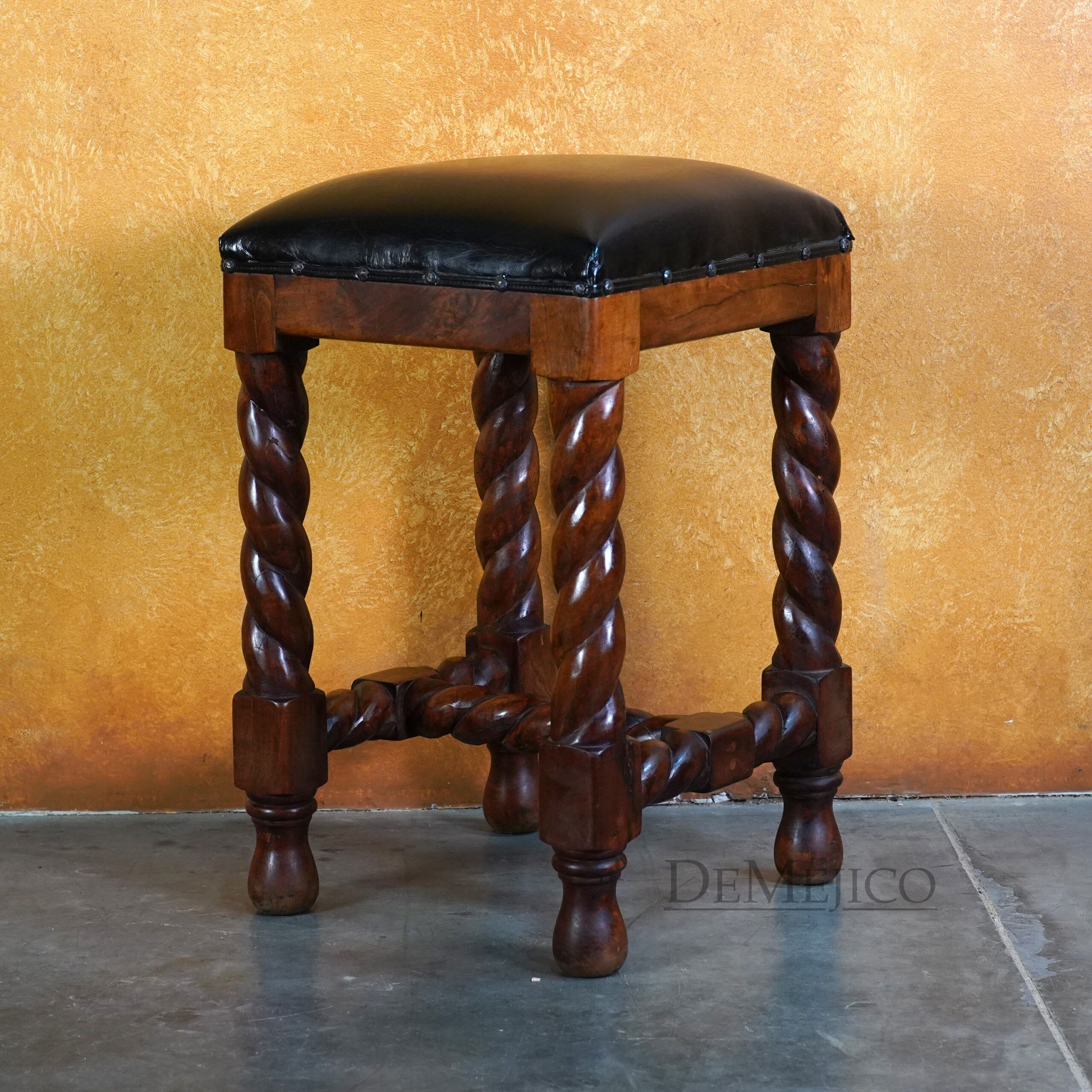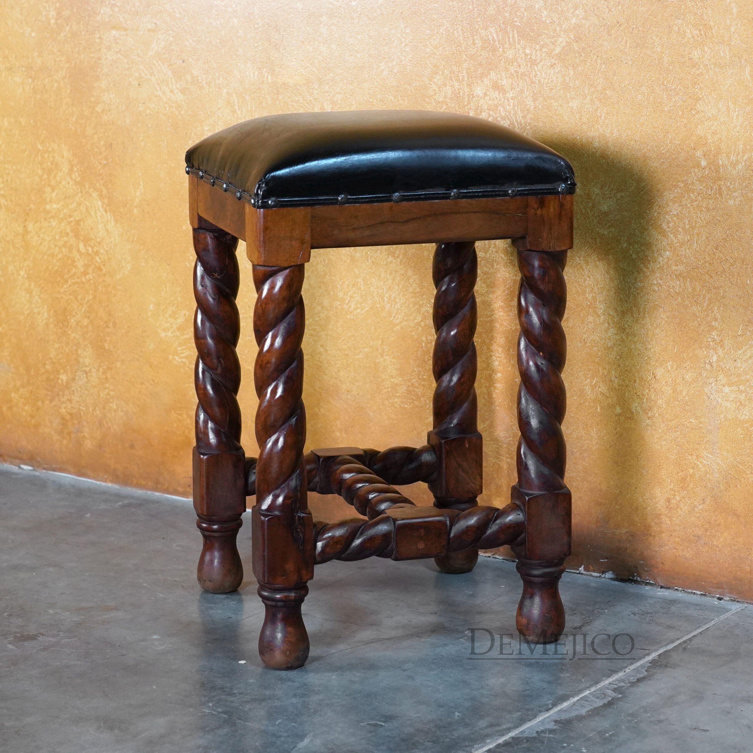 A backless Spanish bar stool featured in our Bar Catalog, the Backless Chapital Barstool shows off thick mesquite wood legs, hand carved in a twisted rope design to follow our popular “Chapital” style. Upholstered with a dark vintage leather and hand pounded iron clavos around the seat’s edge, the Backless Chapital Barstool has the perfect amount of Spanish style. Add this Spanish counterstool to your bar, restaurant, or dining space for a classic and elegant Spanish touch.