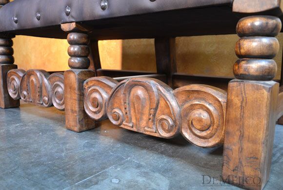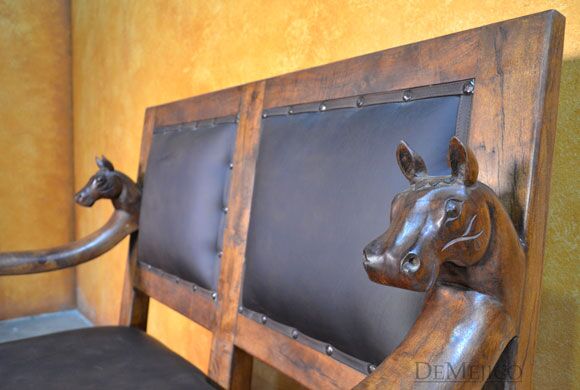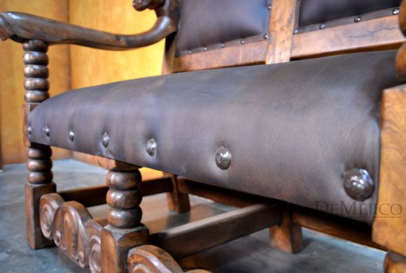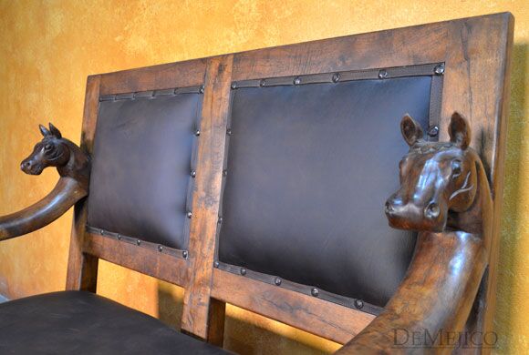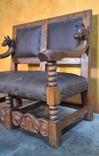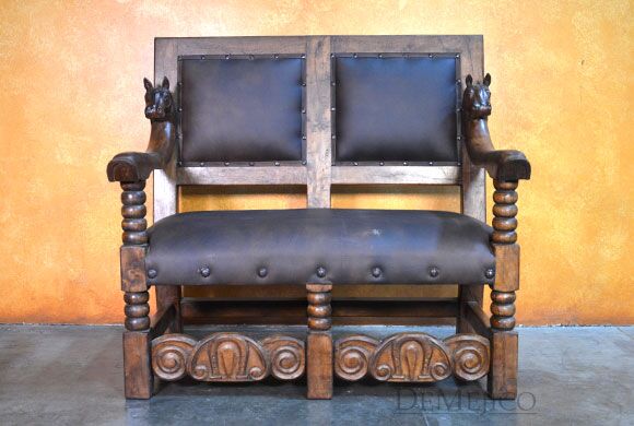 The Banca Caballos Spanish Colonial Loveseat is a unique bench made from solid mesquite wood, featuring hand carvings and a soft genuine leather seat. This 5ft leather seat bench showcases the feel of authentic Spanish furniture.