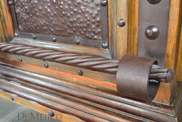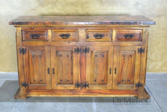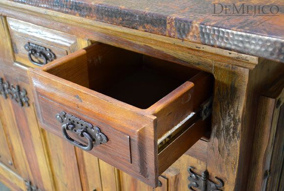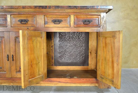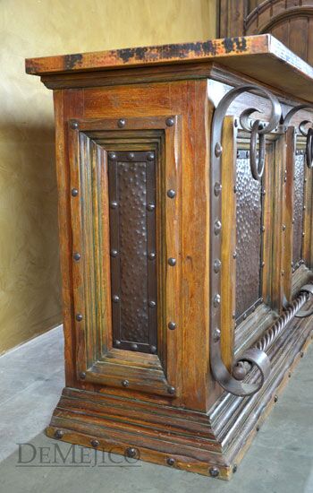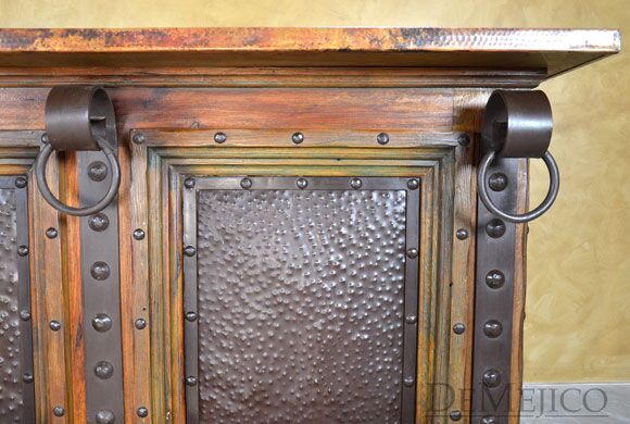 Featured in our Bar Catalog, the Barra Alamo with Copper Top is a rustic style bar, made from reclaimed wood. Featuring a hand pounded copper top and paneling on the front side, and finished off with hand forged iron accents, this bar has a unique, Old World feel. The backside of this copper top bar is complete with four drawers and four cabinets, also complete with hand forged iron hardware, for a great deal of storage for any restaurant or entertainment space.