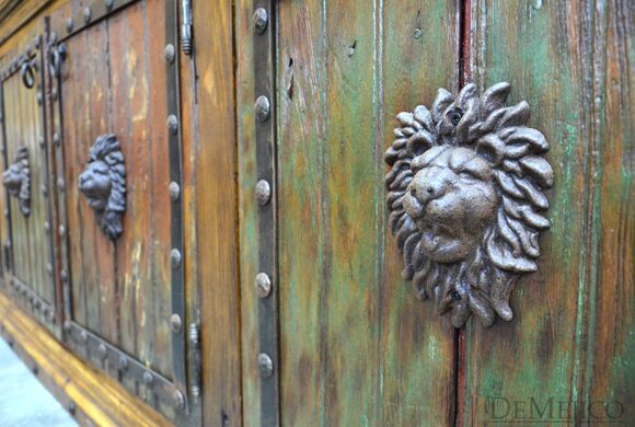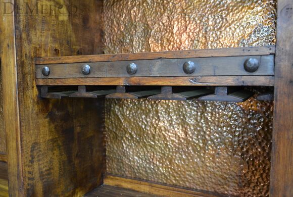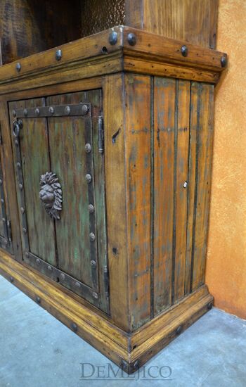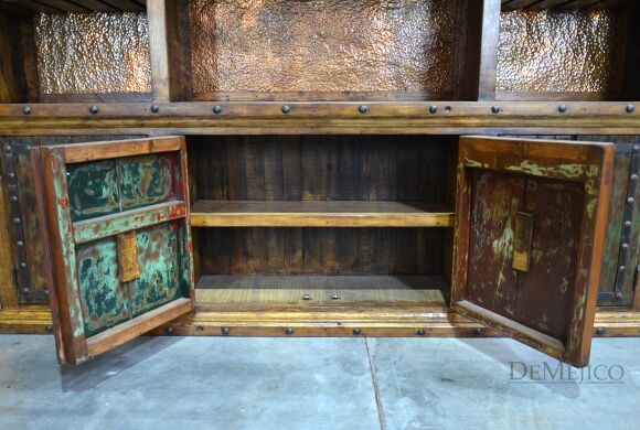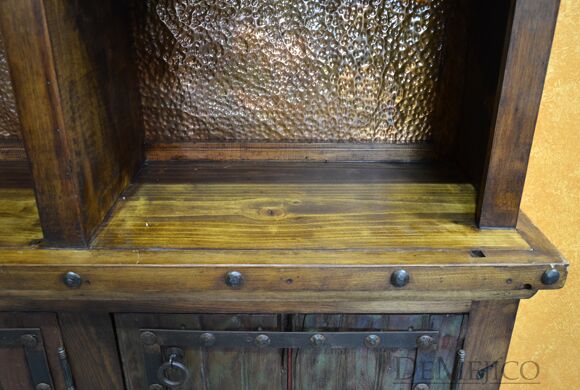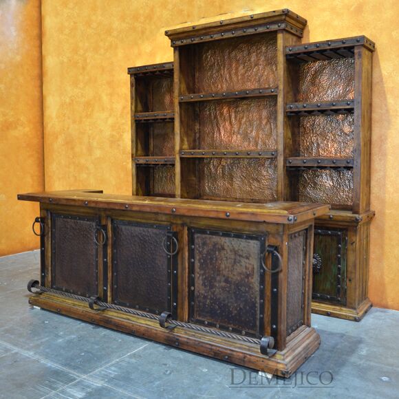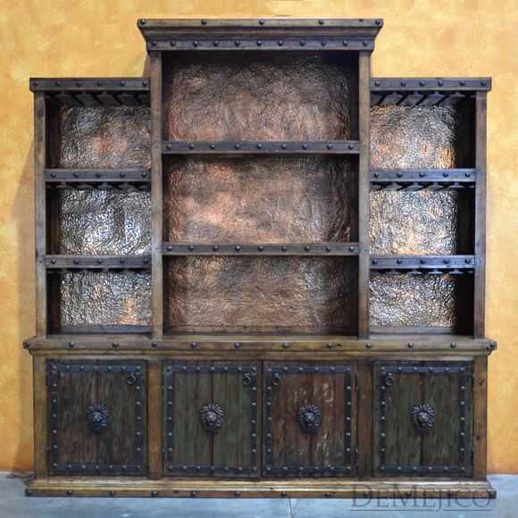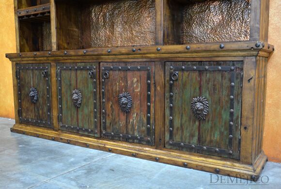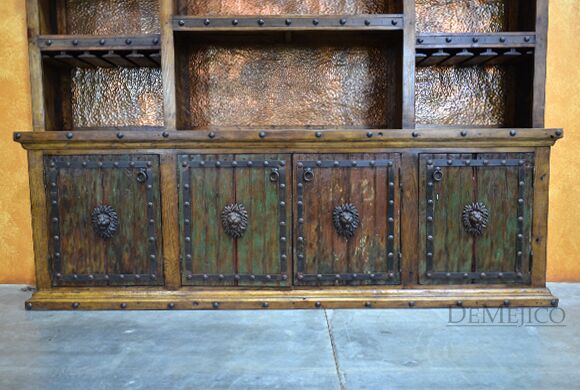 The Barra Antigua is a grand copper panel bar in our Bar Catalog. Made up of two parts, this large Spanish bar is sure to grab anyone’s attention. The Front Barra Antigua makes up the shorter, front piece of this bar (and can be purchased alone). The back piece of this bar is made up of two pieces. The bottom half of this back bar features four old wood cabinets, each accented with a hand painted Patina finish, a lion’s head accent, and hand forged iron straps and clavos. The top half of this back bar features three sections of shelving with hand pounded copper backs and wine glass storage racks. Perfect for any large restaurant or entertainment space, the Barra Antigua provides both style and function with authentic Spanish flair. Ask us about custom creating restaurant furniture for your business!