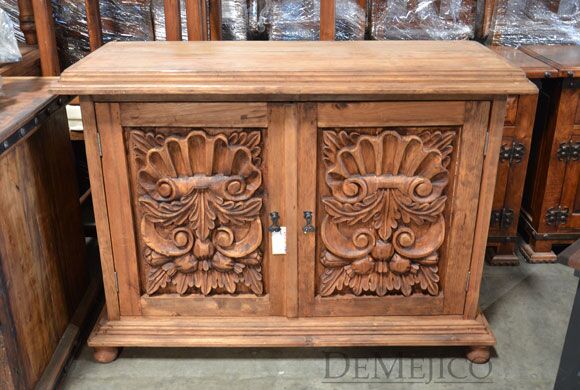 The Comoda de Talla hand carved buffet is beautifully made from solid pinewood. Featuring raised legs and intricately carved floral designs as the focal points, this buffet will bring an elegant Spanish feel to your dining room. With two cabinets and a smooth top, this buffet has a great deal of space for storage and display.