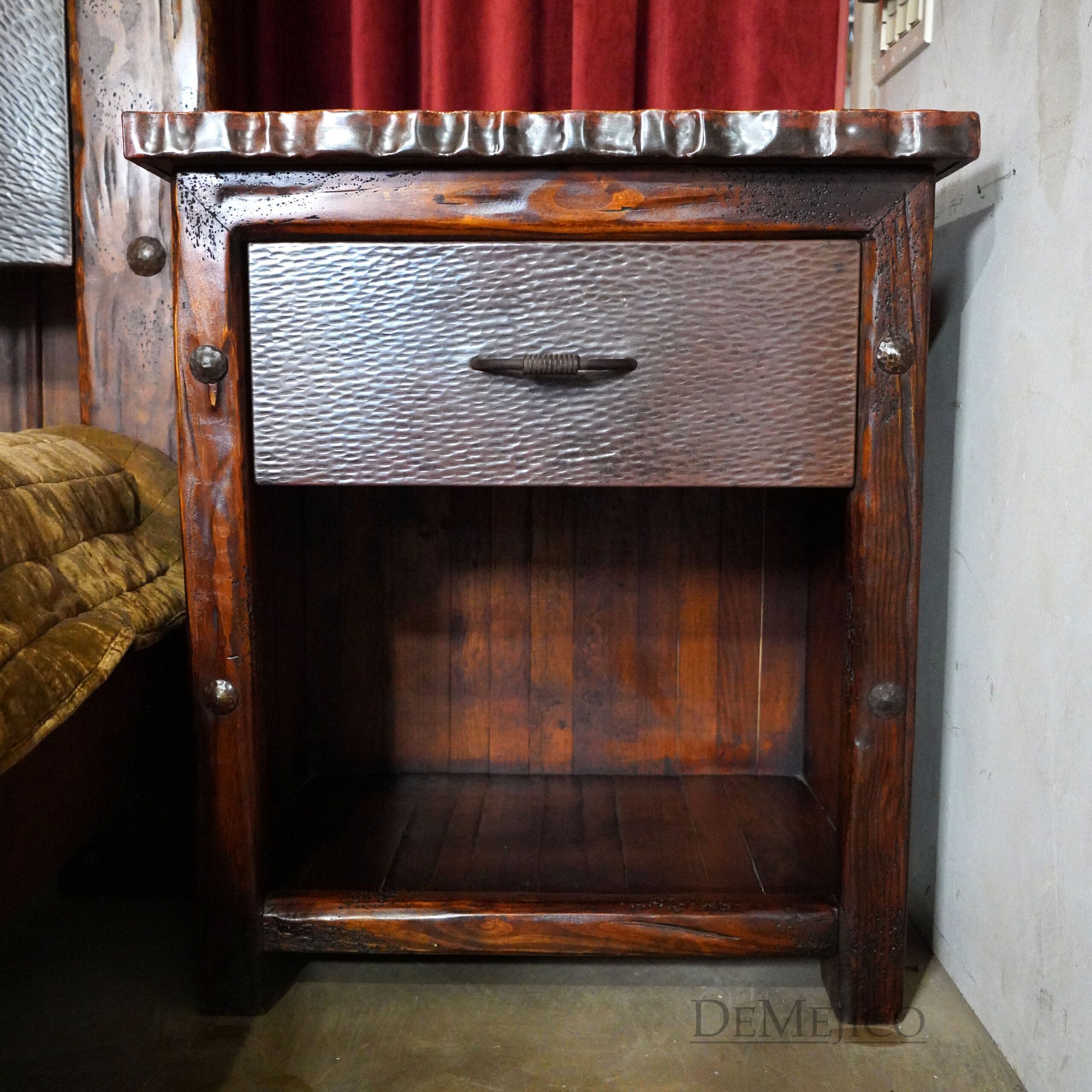 The Buro Villa Hermosa, featured in our Bedroom Catalog, is a freshly designed Southwest style nightstand. Hand crafted to compliment the Cama Villa Hermosa, these copper nightstands showcase a fully copper paneled drawer, with a one of a kind “jagged” edge top, inspired by a beautiful mountain range. Carved from solid old wood, the Buro Villa Hermosa showcases natural knots and stretches, adorned with large, hand pounded iron clavos. Whether you’re country living, or just want a touch of the Southwest style, the Buro Villa Hermosa copper nightstand is a perfect addition to your bedroom oasis.