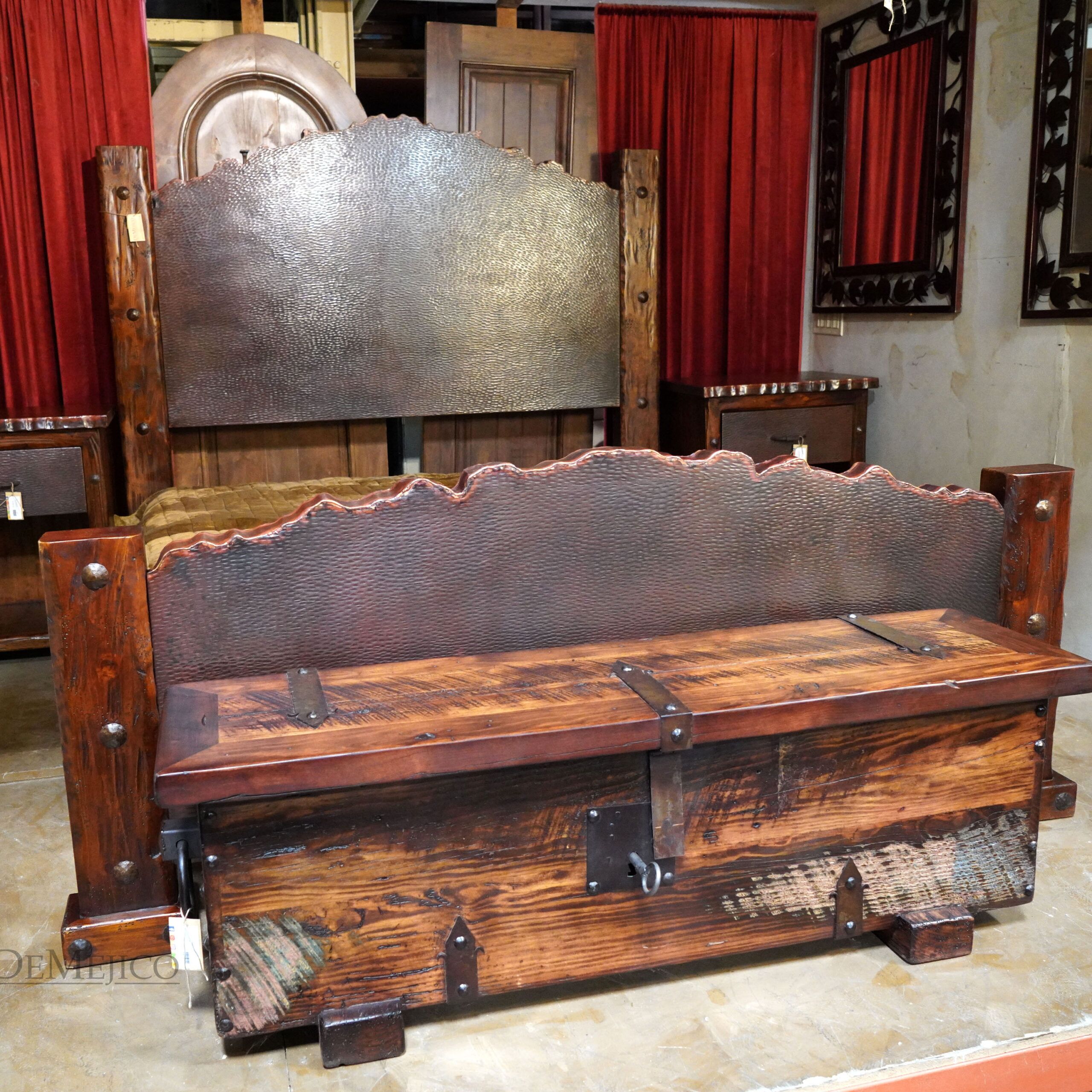 The Cama Villa Hermosa, featured in our Bedroom Catalog, is a freshly designed Southwest style bed. The fully copper paneled headboard and footboard each feature a one of a kind “jagged” edge top, inspired by a beautiful mountain range. Carved from solid old wood, the Cama Villa Hermosa showcases natural knots and stretches on each of its four posts, which are also adorned with large, hand pounded iron clavos. Whether you’re country living, or just want a touch of the Southwest style, the Cama Villa Hermosa copper bed is a perfect addition to your bedroom oasis.