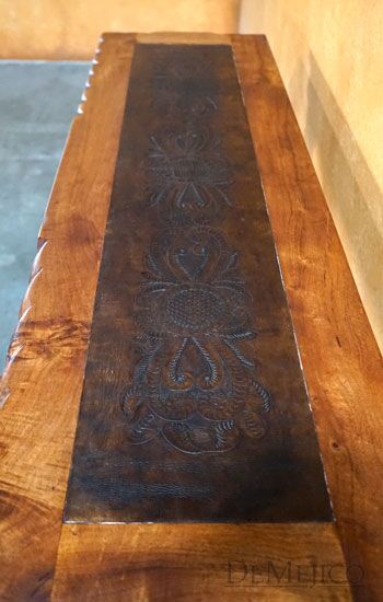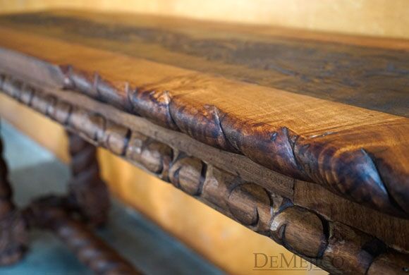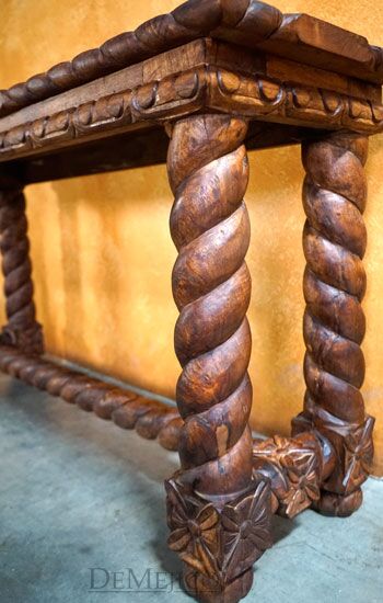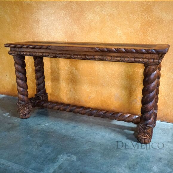Brand new to our Living Room Catalog, the Chapala Console Table is a Spanish Revival Console Table that takes inspiration from our popular “Chapala” style. Hand crafted from solid mesquite wood, this Spanish console table features a smooth top, complimented by a rope edge top, thick rope twisted legs, and a trestle base. Sure to grab your attention, the top of this console features the most beautiful, hand tooled, leather inlays. The Chapala Console Table is the perfect console for any Spanish style living or entertainment space, if you’re looking for Spanish style with an elegant touch.