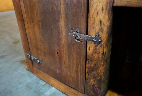 The Colonial Bar is an addition to our Bar Catalog, inspired by our popular Colonial style consoles, buffets, and entertainment centers. Made from solid old wood, this bar is sure to bring a rustic feel to your restaurant or entertainment space. Beautifully designed, the contrast of the light and dark woods grab your attention, while giving off a classic rustic look. With a Colonial style in mind, this old wood bar features subtly carved arches and movements along the bottom, sides, and under the main top. The backside features a single drawer, cabinet and two shelf spaces for just the right amount of bar storage. Hand forged iron hardware accents this rustic Spanish bar for a complete Spanish look.