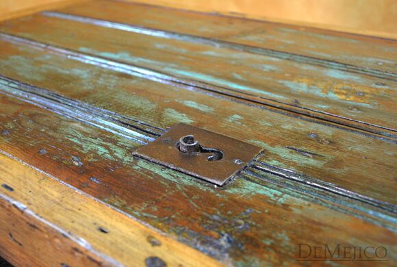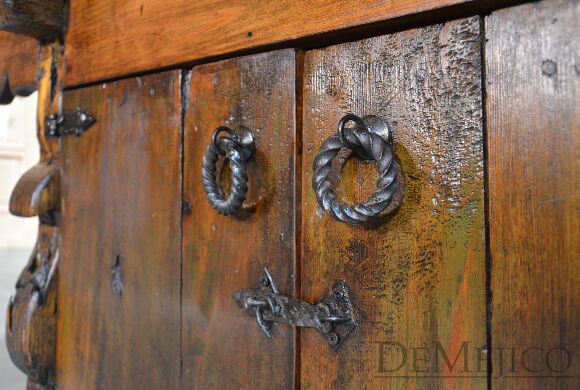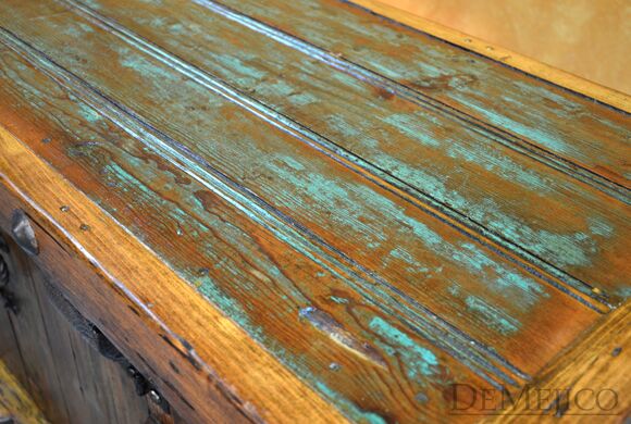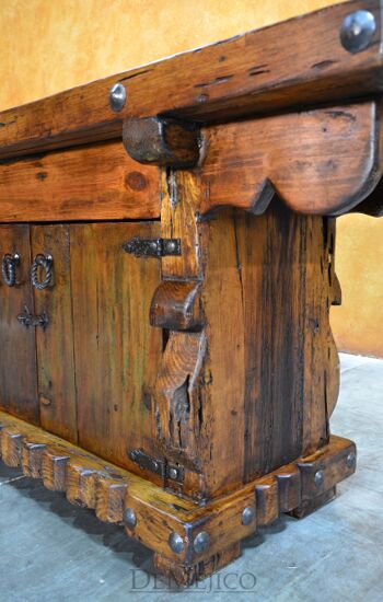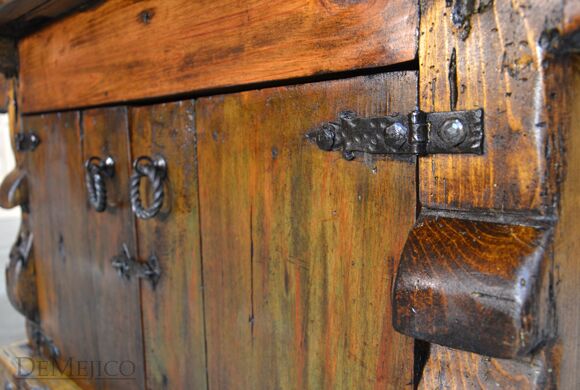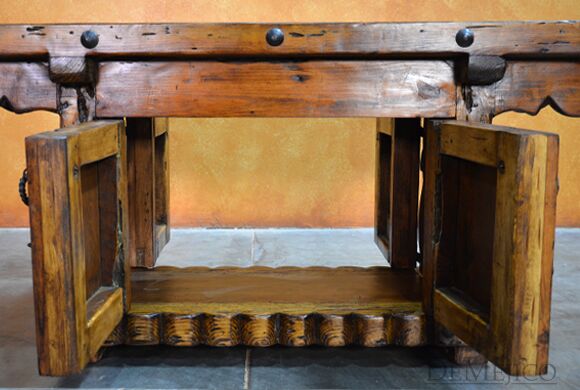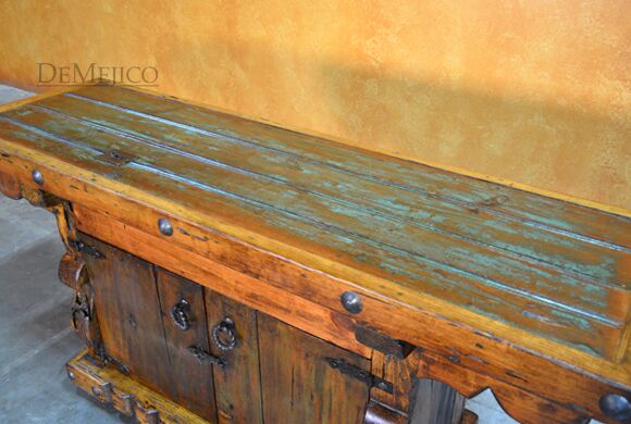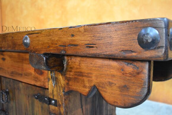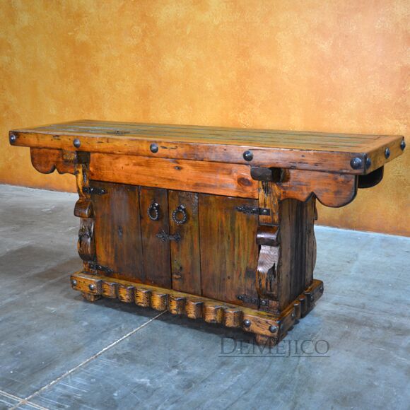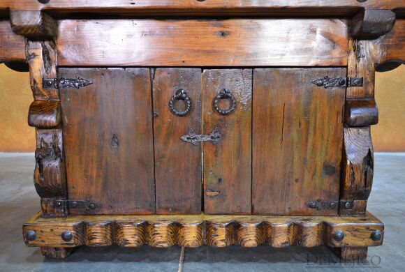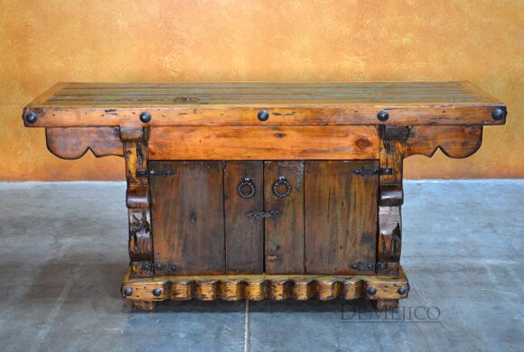 The Colonial Old Door Island is an addition to our Bar Catalog, inspired by the Colonial Old Door Console. Made from solid old wood, with an old door top and Patina cabinet facing, this island is sure to bring a rustic feel to your kitchen, bar, or entertainment space. Double cabinet doors on front and back of this island makes for a one-of-a-kind bar island. Beautifully designed, the contrast of the light and dark woods with a touch of color grab your attention, while giving off a classic rustic look. With a Colonial style in mind, this island table features subtly carved arches and movements along the bottom, sides, and under the main top. Hand pounded and forged iron hardware and clavos accent this old wood island for a complete Spanish look.