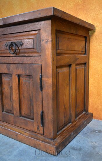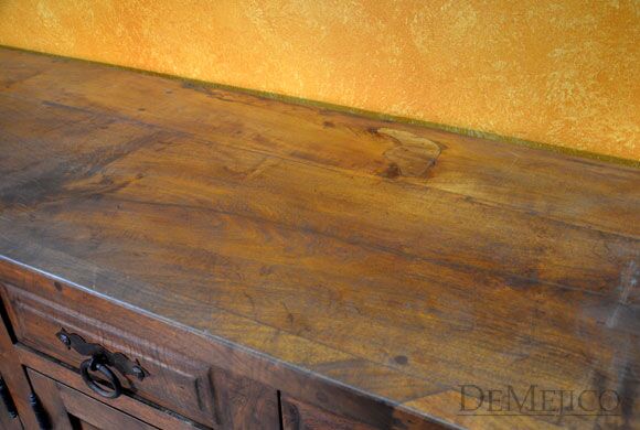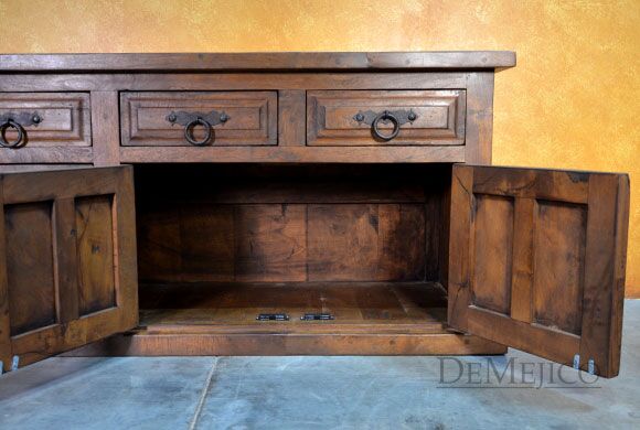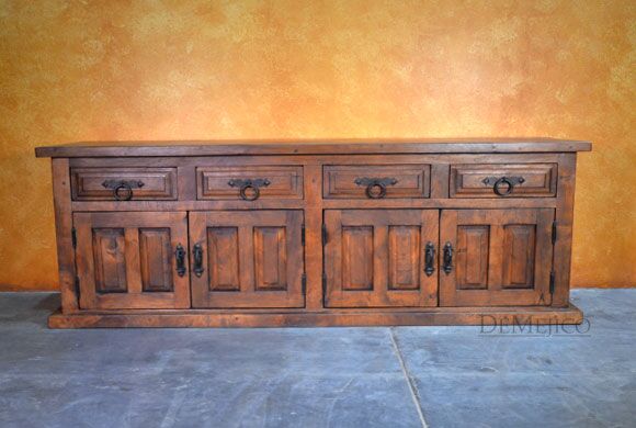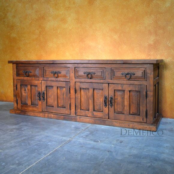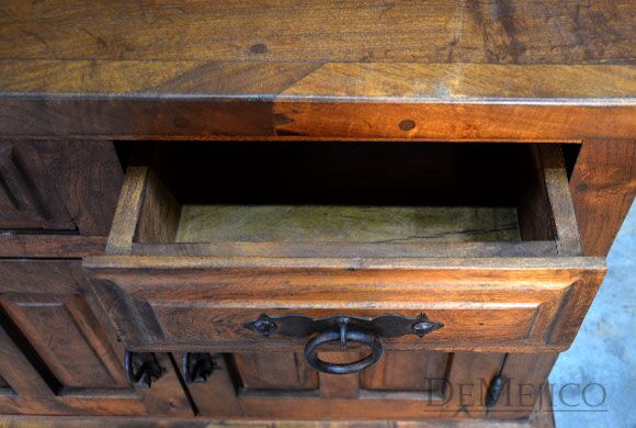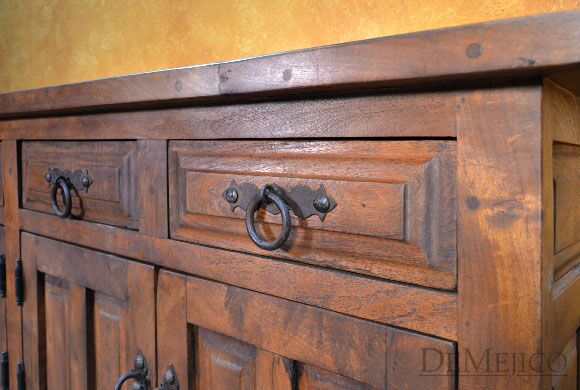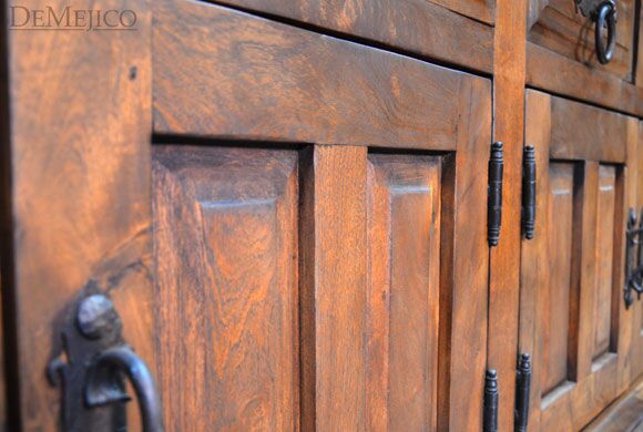 Featured in our Dining Catalog, the Comoda Misión is a beautiful and eye-catching Spanish buffet, hand crafted from solid mesquite wood. With raised paneling on each, four drawers and four cabinets give this buffet both style and functionality. Giving this classic beauty a touch of Old World style influences, hand forged iron hardware pulls complete the look of the Comoda Misión. Add this Old World buffet in your dining space, foyer, or restaurant for an authentic touch of Spanish and Old World design.