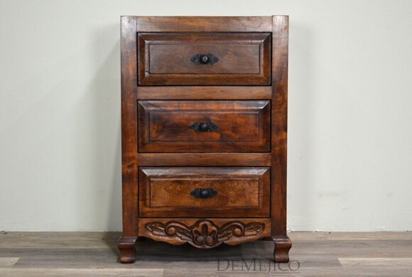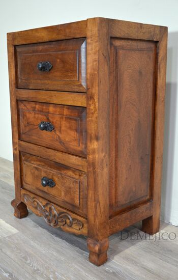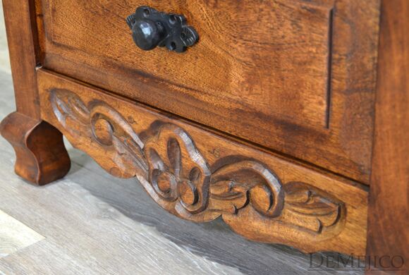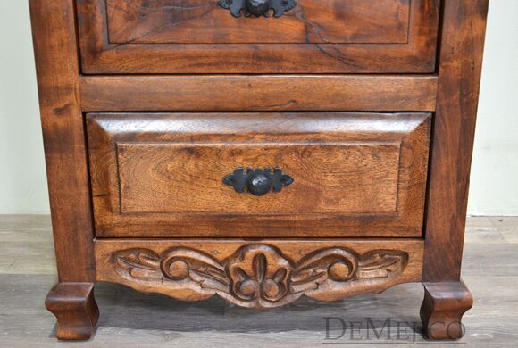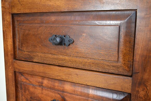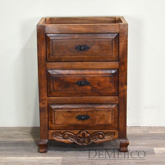 The Concha Bathroom Vanity is a beautiful Spanish style vanity made from solid mesquite wood. This vanity features slightly arched, raised legs and subtle carvings along the bottom. Three raised paneled drawers allow for a great deal of storage for any bathroom space. Finished off with hand forged iron hardware, the Concha Bathroom Vanity will bring a delicate touch of Spanish design to your home.