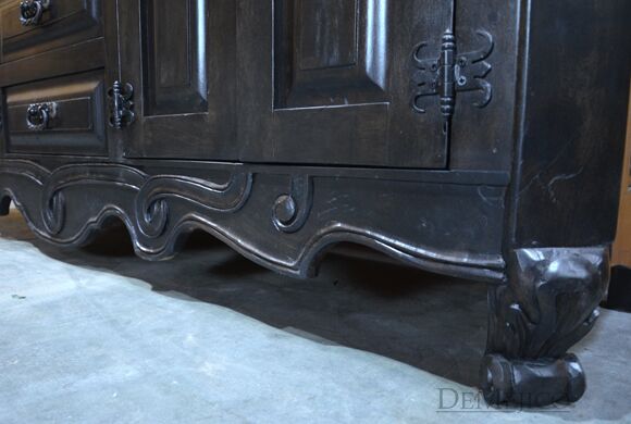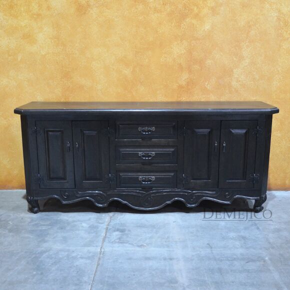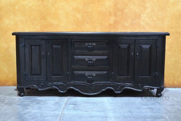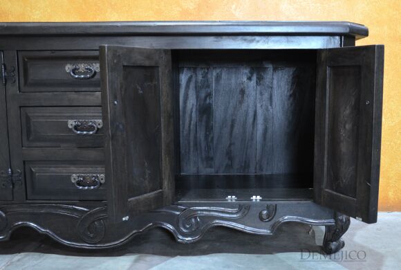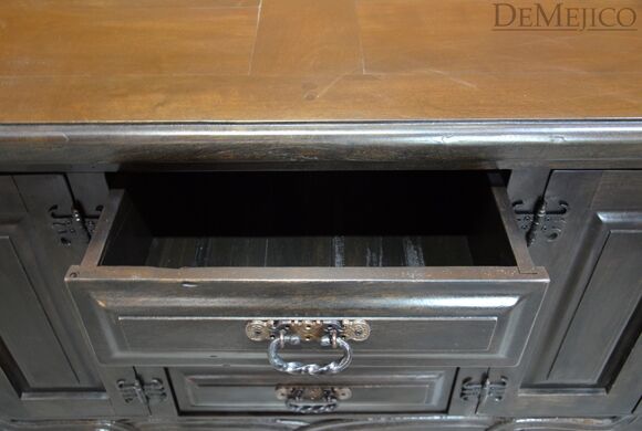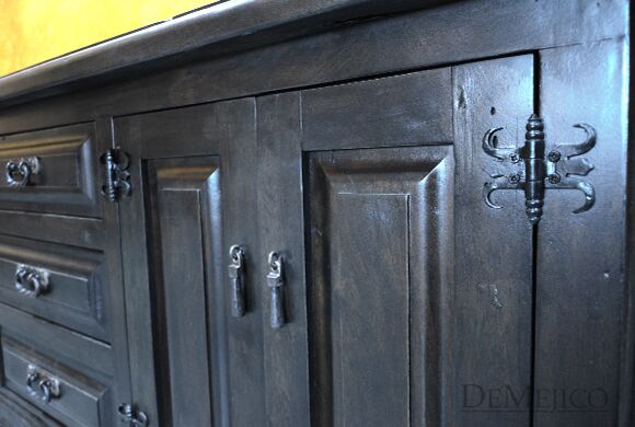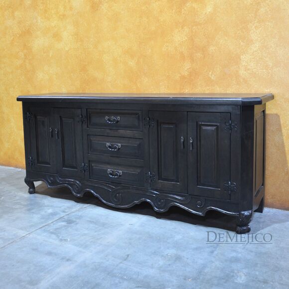 The Conquista Buffet is a classic, Spanish buffet that takes design inspiration from our popular Conquista Hutch. Completely hand carved from solid mesquite wood and finished in a unique dark stain, this buffet is a classic beauty with Old World style influences. Finished off with hand forged iron hardware on each of the drawers and cabinets, intricate designs and raised legs on the bottom, the Conquista Buffet is fit for any Spanish restaurant or dining space.