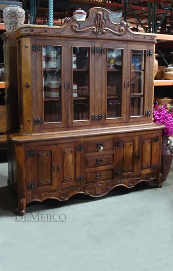 The beautiful Conquista Spanish Carved Hutch is a classic beauty with deep old world Spanish influence. The hutch is beautifully hand carved from aged mesquite wood with the main Conquista design as the focal point, and the presence is boasted with tapered ends. The Conquista Hutch is complete with specially designed weathered iron hardware.