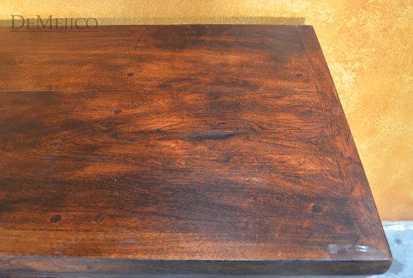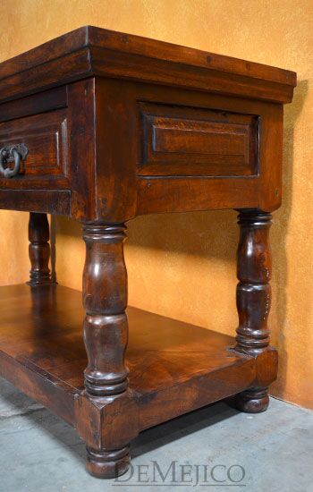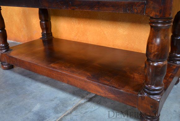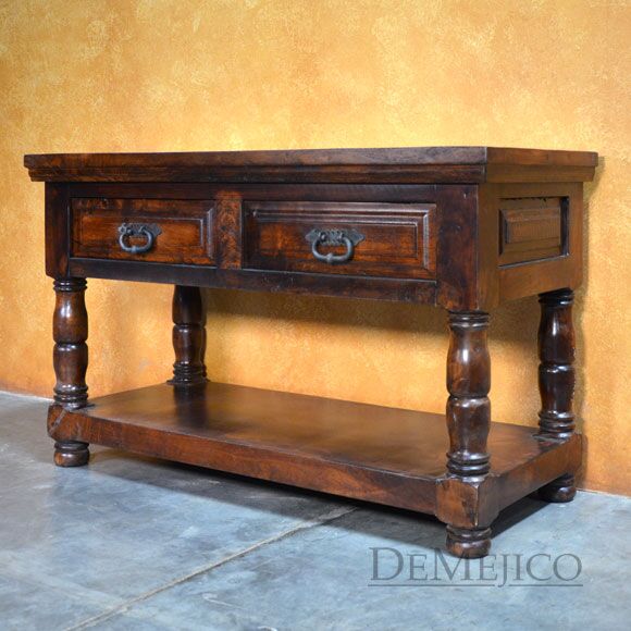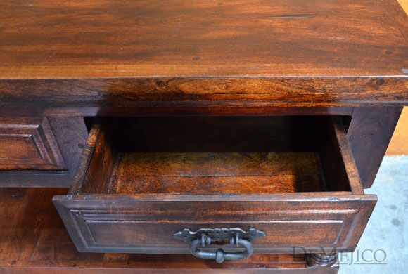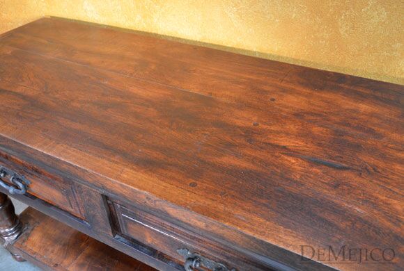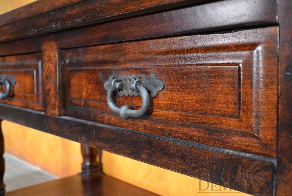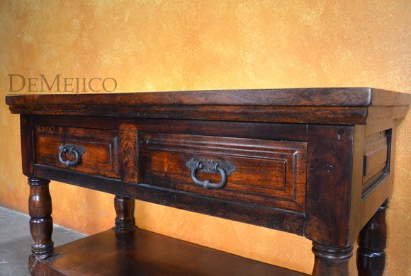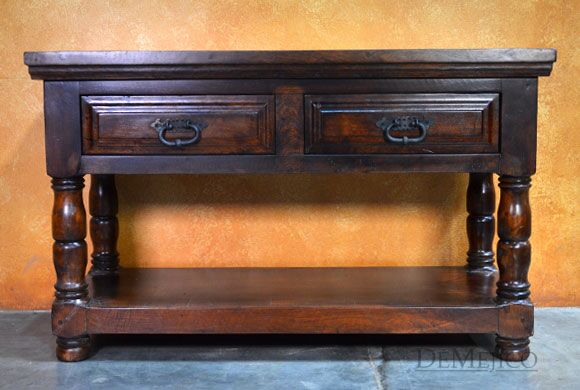 The Consola Misión is a beautiful Spanish console table made from solid mesquite wood. Finished in a dark stain, this console elegantly showcases the natural stretches and wood movements throughout the entire piece. Under two large raised panel drawers, thick, hand turned legs hold up an added bottom shelf for even more storage space. Finished off with hand forged iron hardware, the Consola Misión is a subtle, yet authentic Spanish console table, fit for any living, entertainment or foyer space.