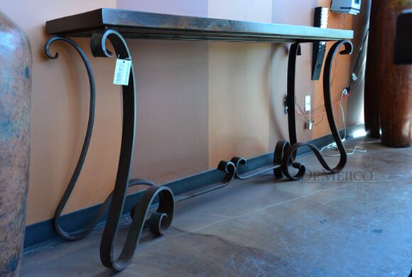 An iron base console table, the Consola Santa Paula with mesquite is a beautifully radiant piece, featuring a rich, dark mesquite surface suspended by hand-forged wrought iron scrolled legs. Ask us how we can customize this elegant console table to your interior spacing.