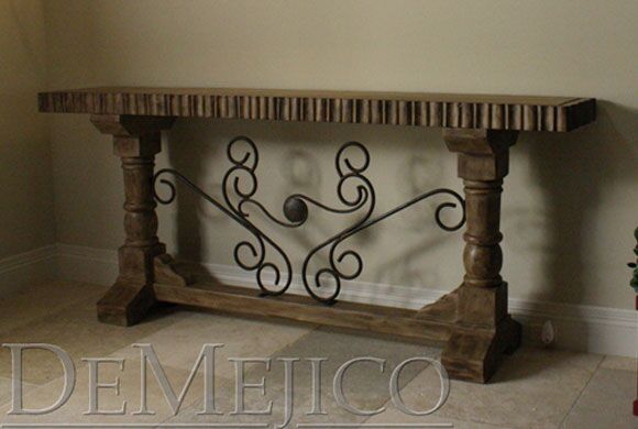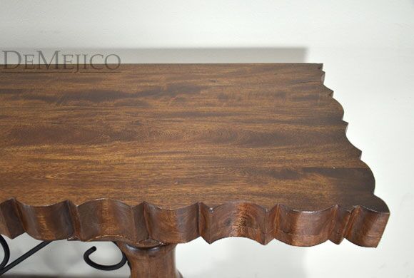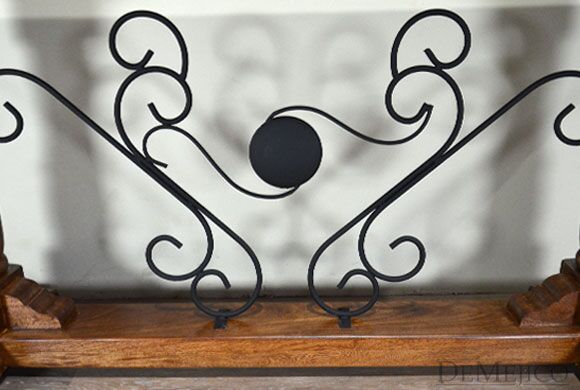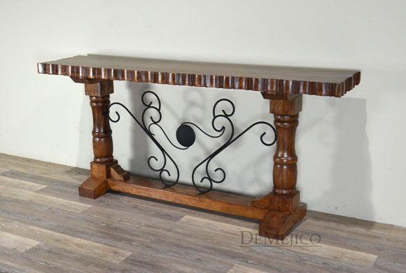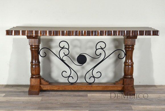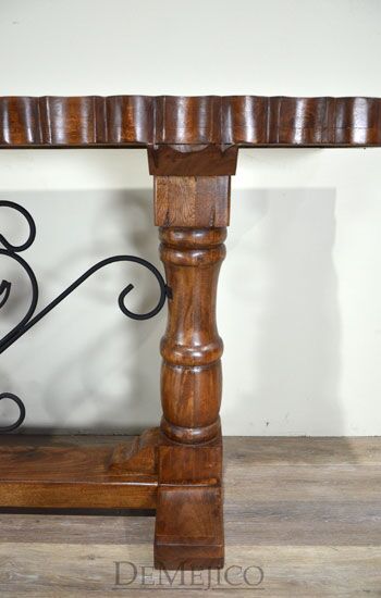 In the style of a carved Mediterranean console table, the Consola Tornos Alder features an eccentric wrought iron rocaille motif, knotty alder wood, and hand-chiseled table edges make this contemporary, one-of-a-kind piece such a visually stunning Spanish console table.