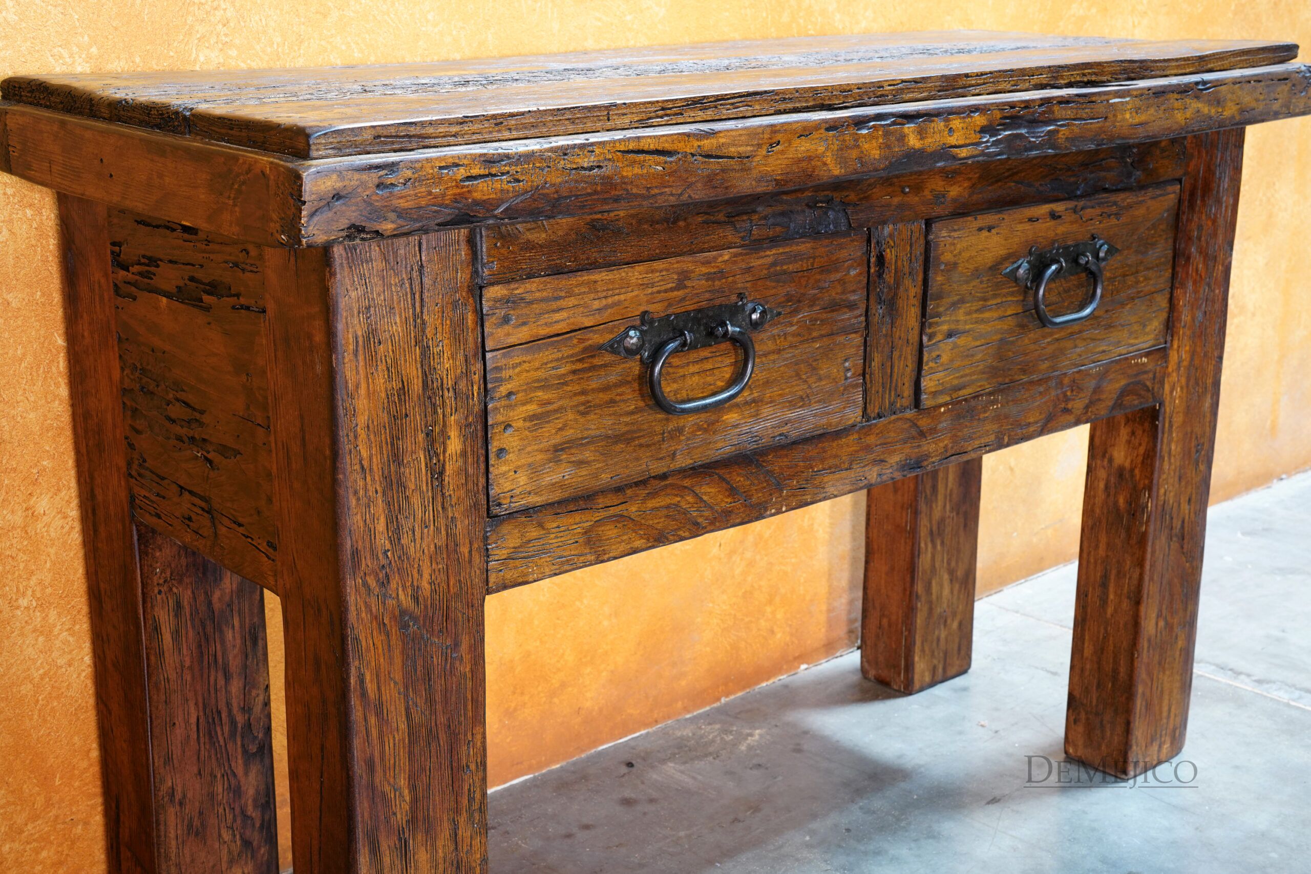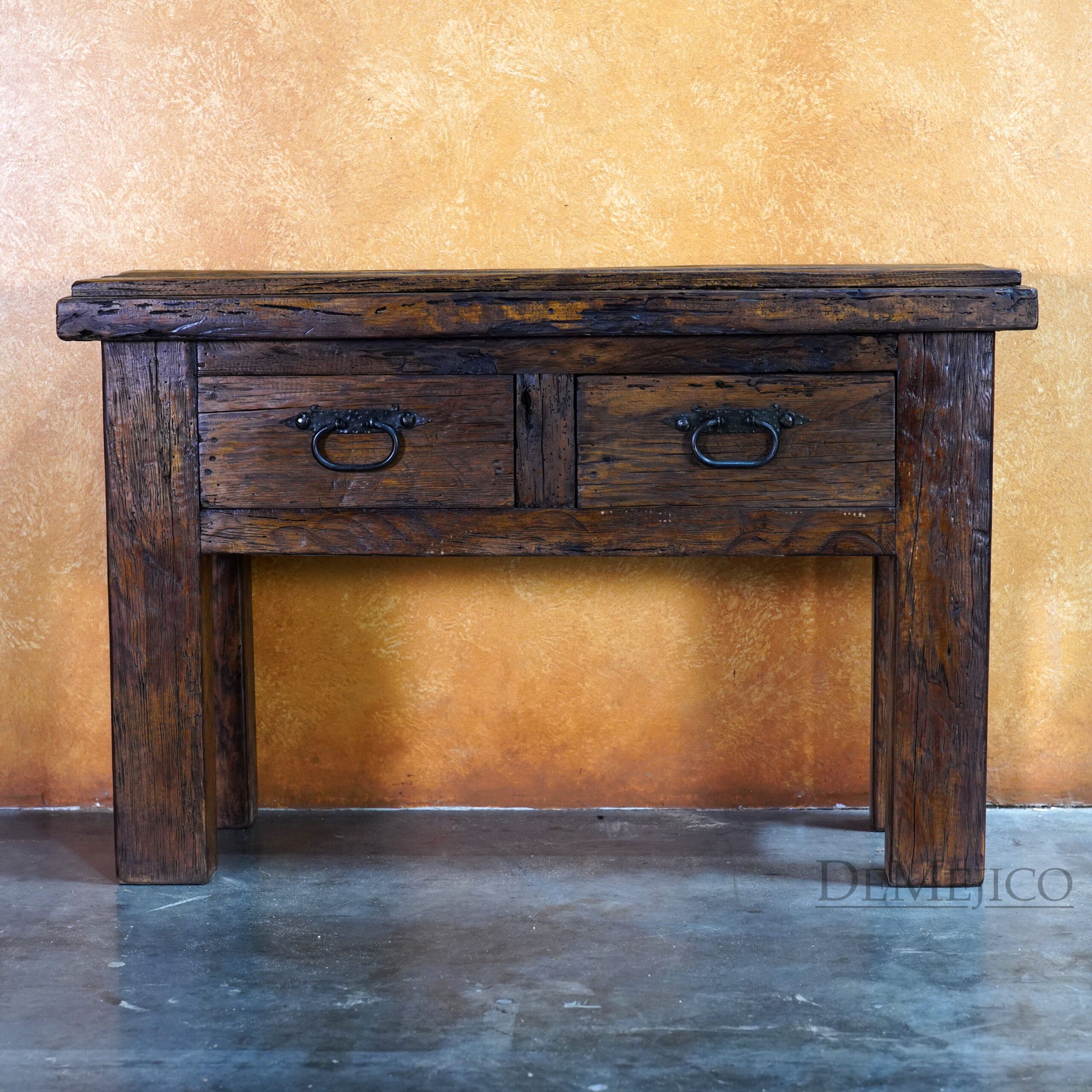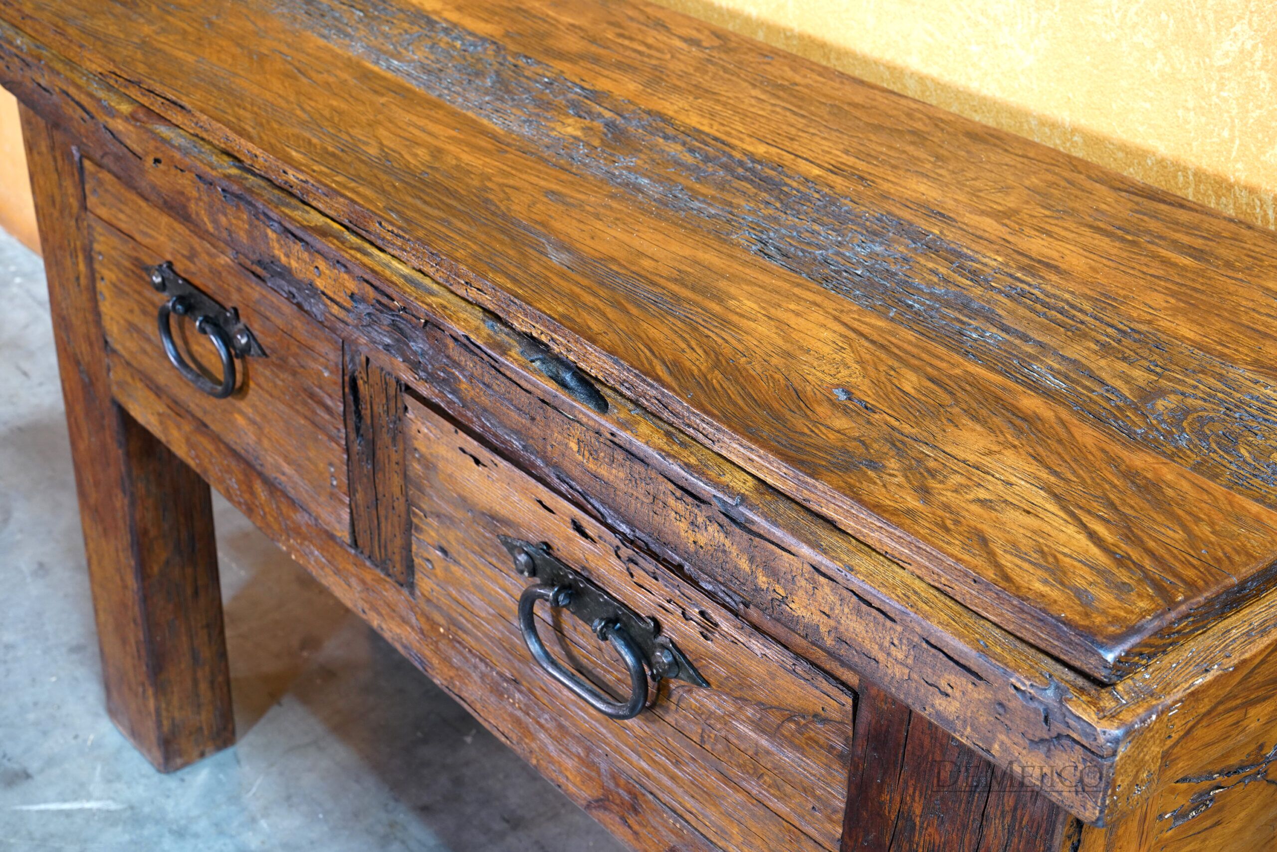 The Consola Troje is an old door console table with rustic style. With an old door top, this console table showcases the natural imperfections of the wood in its original state. Completing the bold look of this antique style console table, we have finished it off with thick and sturdy legs, and two large drawers, all of which are made from reclaimed wood and showcase even more natural rustic elements. Large, hand forged iron pulls complete the drawers and the rustic style.