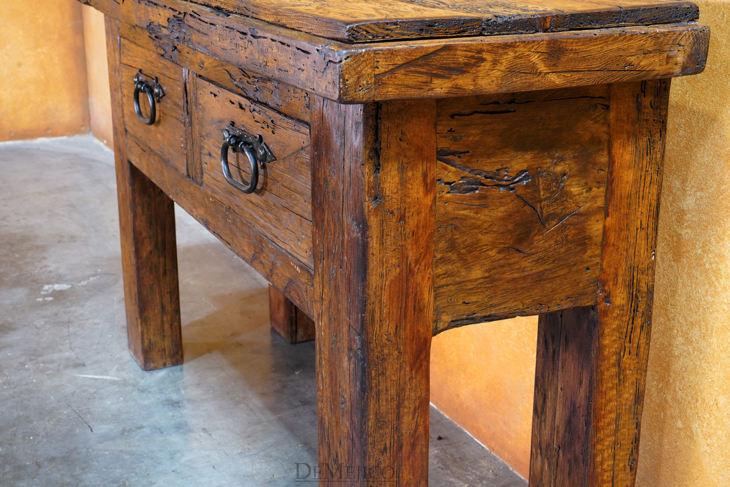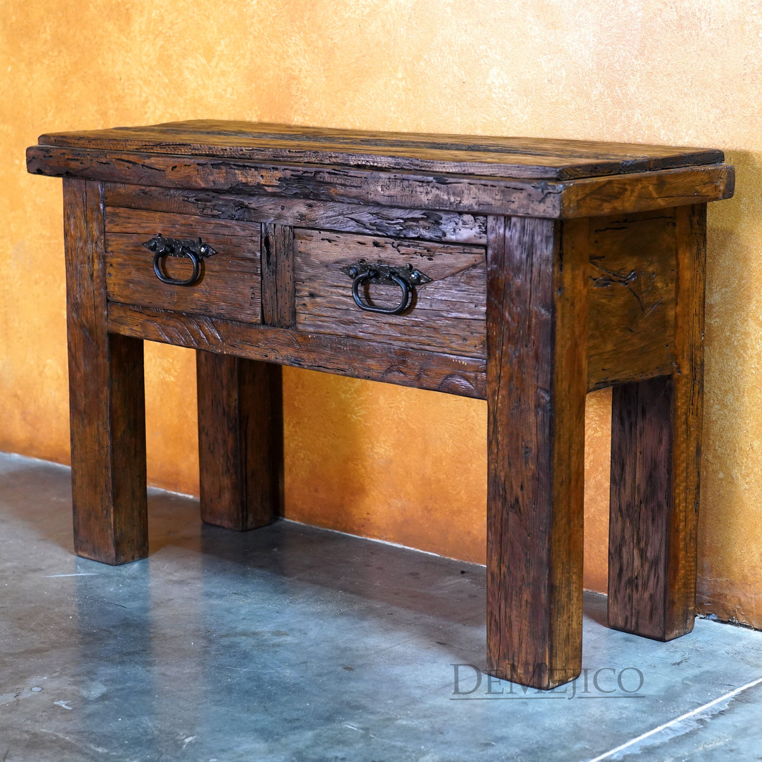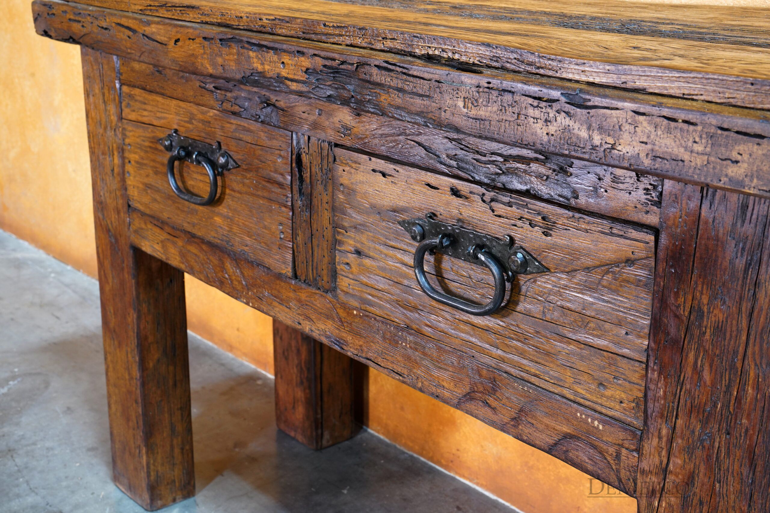The Consola Troje is an old door console table with rustic style. With an old door top, this console table showcases the natural imperfections of the wood in its original state. Completing the bold look of this antique style console table, we have finished it off with thick and sturdy legs, and two large drawers, all of which are made from reclaimed wood and showcase even more natural rustic elements. Large, hand forged iron pulls complete the drawers and the rustic style.