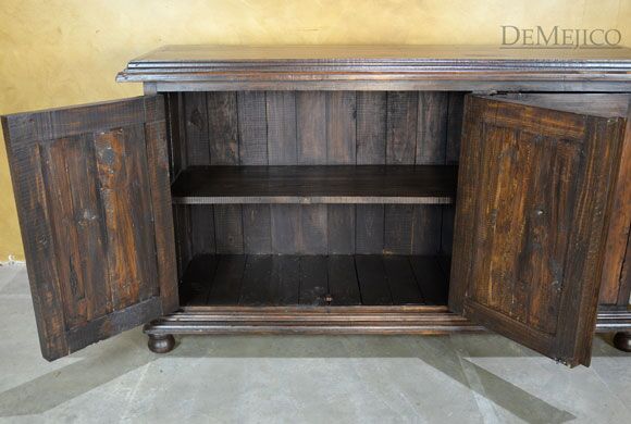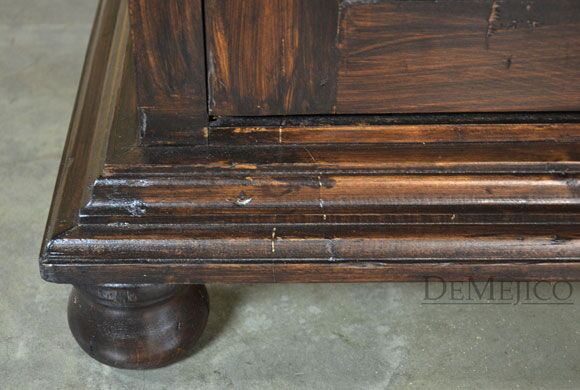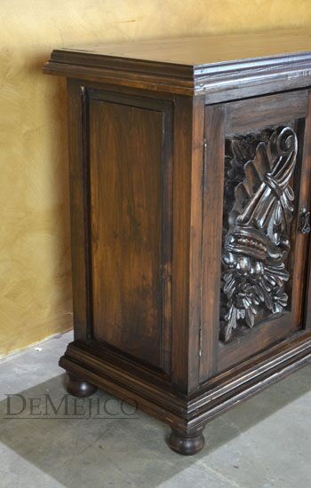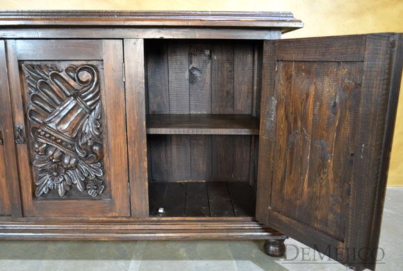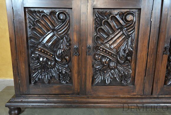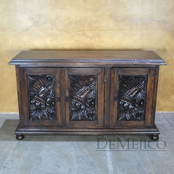 The Cuerno de la Abundancia Dark is a hand carved buffet is beautifully made from solid pine wood. Featuring raised legs and intricately carved floral designs as the focal points, this buffet will bring an elegant Spanish feel to your dining room. With three cabinets and a smooth top, this buffet has a great deal of space for storage and display. Finished in a dark stain.