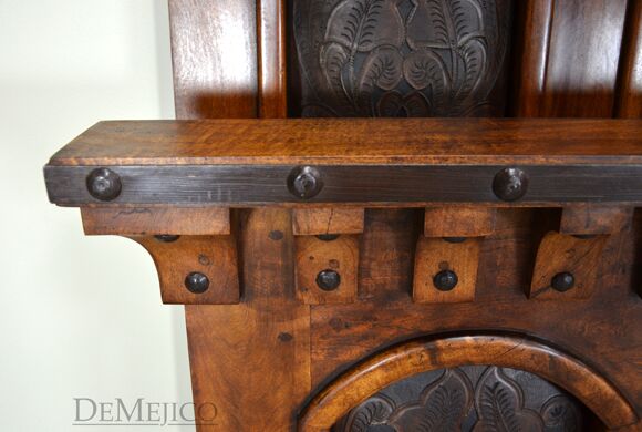 The Dark Chapital Bed is a version of our Chapital Bed. Hand crafted from solid mesquite wood, this tooled leather bed is a beautiful addition to our Bedroom Catalog. Both the headboard and footboard of this bed feature four arched panels of genuine hand tooled leather, featuring a beautiful leaf design. Along the edge of both the headboard and footboard, is an iron strap and small arched accents, each hand adorned with hand pounded iron clavos for a classic Spanish look. Fit for any large bedroom space, the tall headboard gives this tooled leather bed a grand presence.