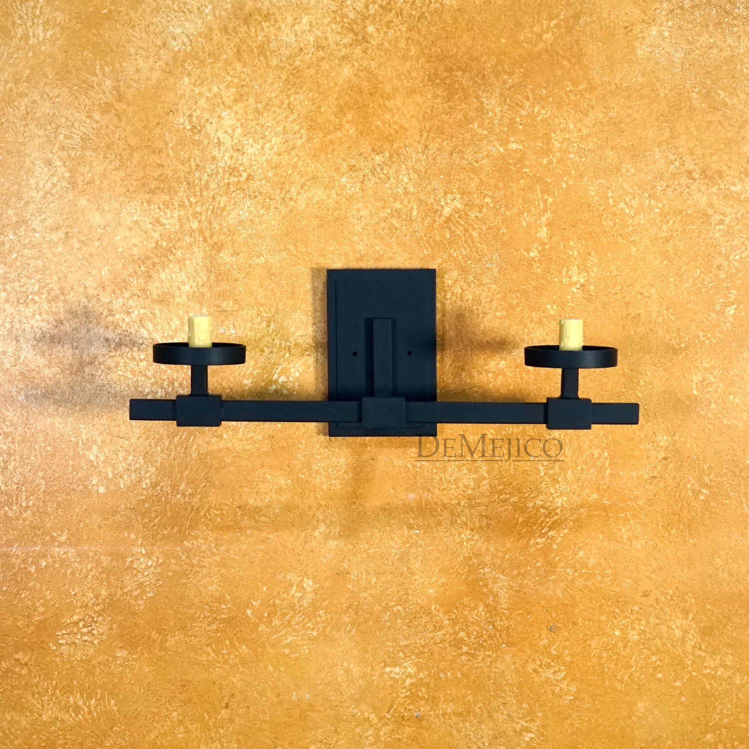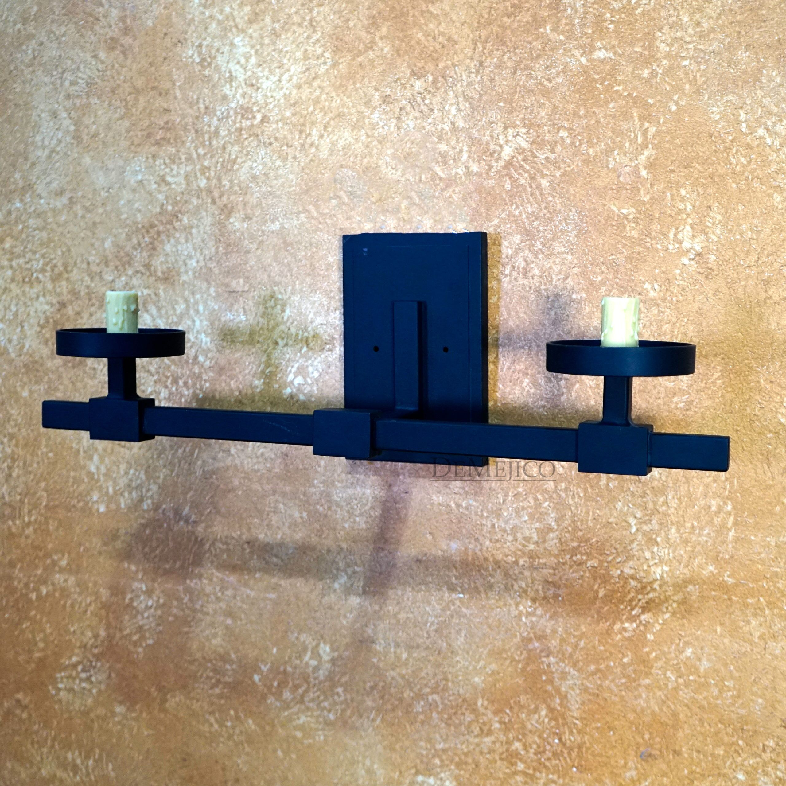 Featured in our Lighting Catalog, the Double Square Sconce is a modern Spanish wall sconce. Finished in a rustic black iron, The Double Square Sconce features two imitation candles, sitting over a simple bar with a singular rectangle backplate. Fit for any simple Spanish style home, this modern Spanish wall sconce is subtle, yet inviting enough for any interior space.