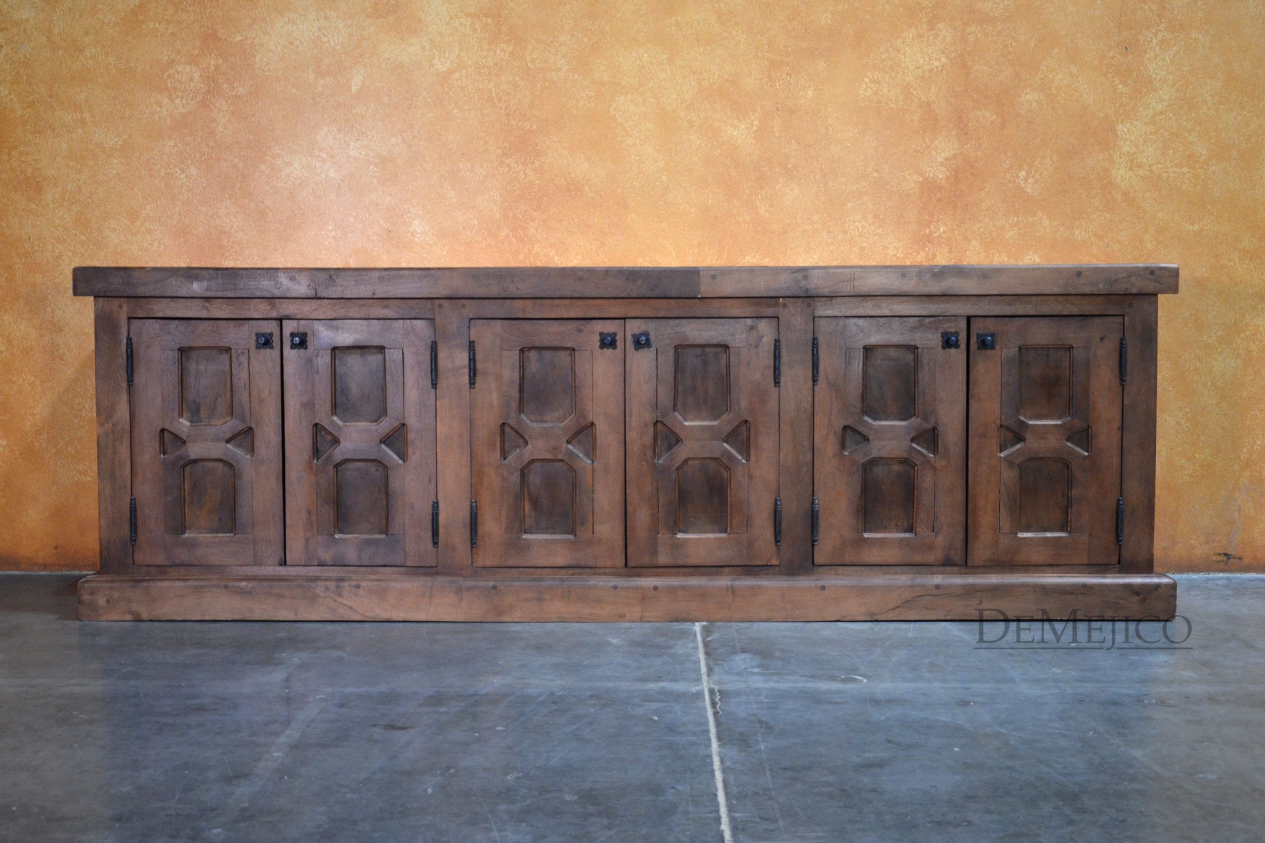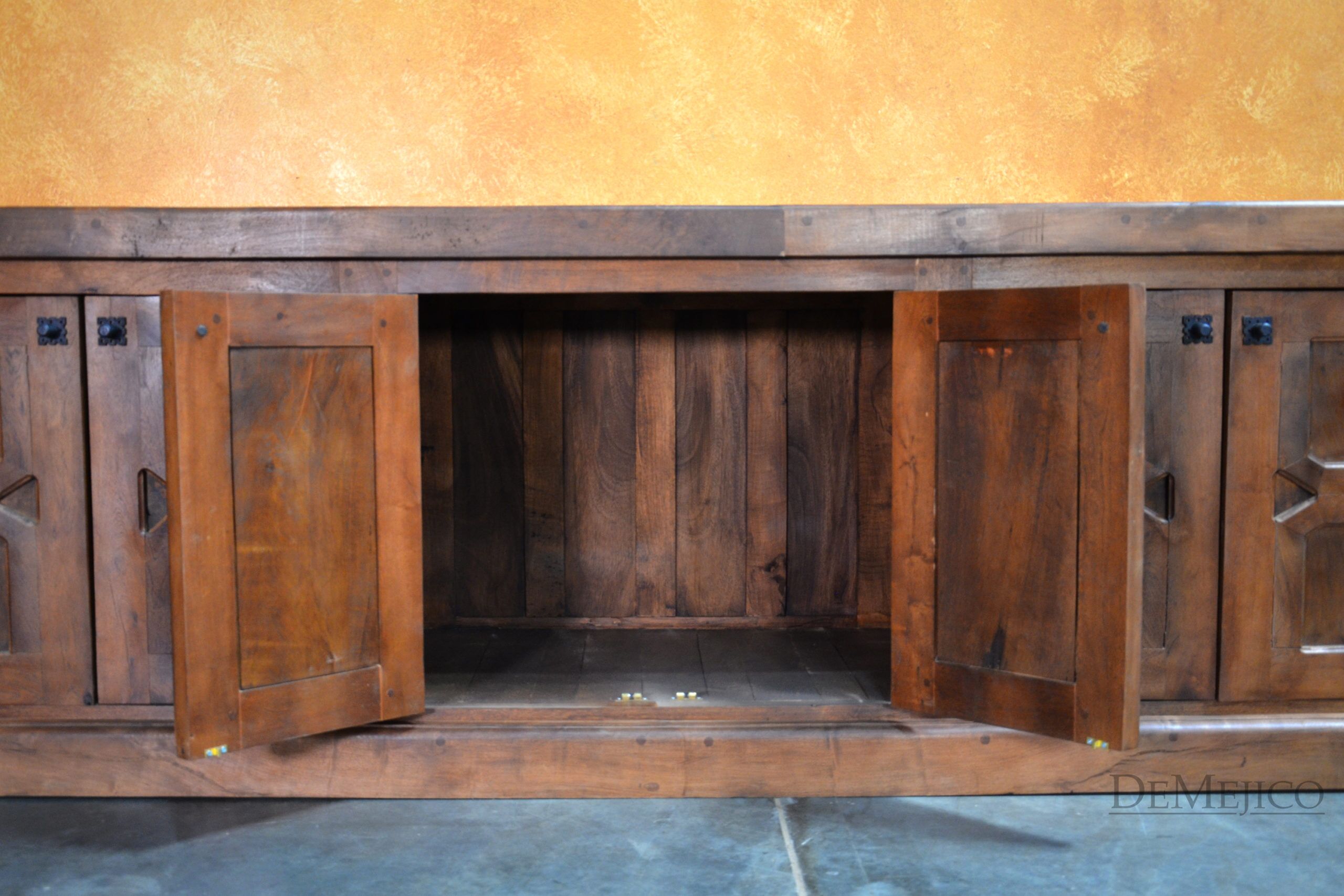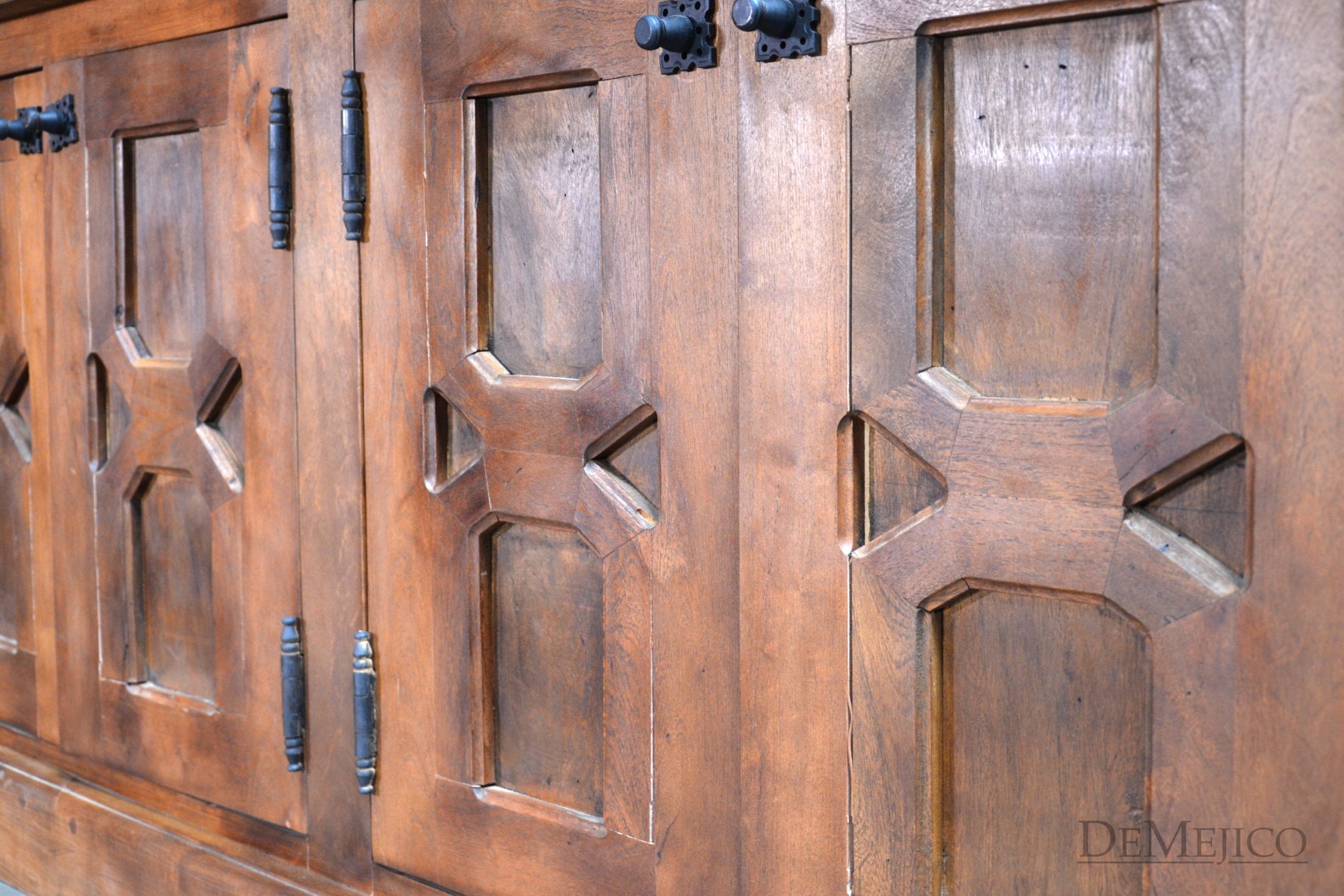 Brand new to our Living Room Catalog, the Eduardo Entertainment Center is a large piece, hand crafted from solid mesquite wood. Featuring unique cut outs throughout the three double door cabinets, the Eduardo Entertainment Center gives off a geometric feel, while still bringing in Spanish touches hand forged iron hardware and pulls. Finished off with a bold edge along the top and bottom, this carved entertainment center can be used in your living, dining, or entertaining space for an attention-grabbing touch and lots of storage.