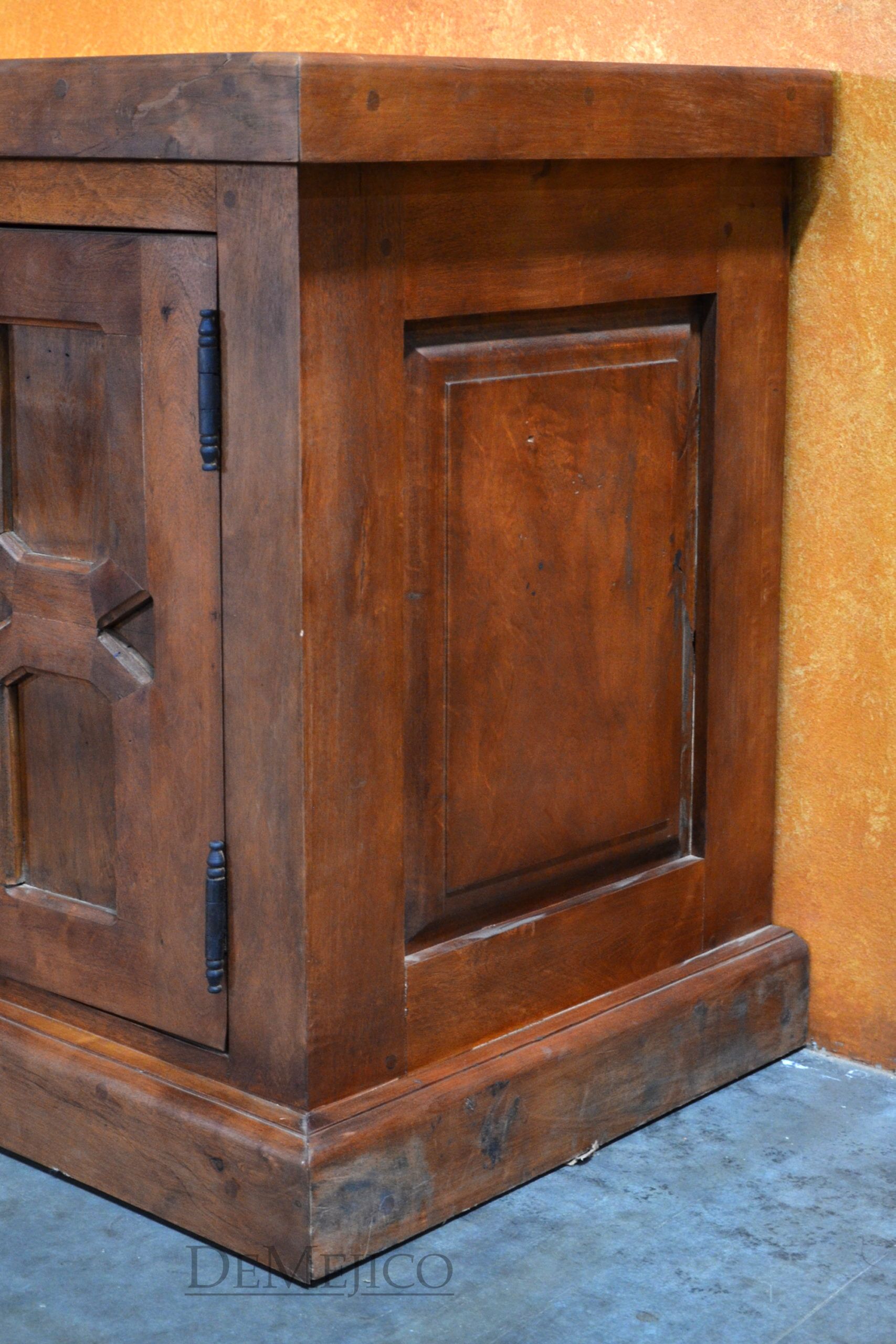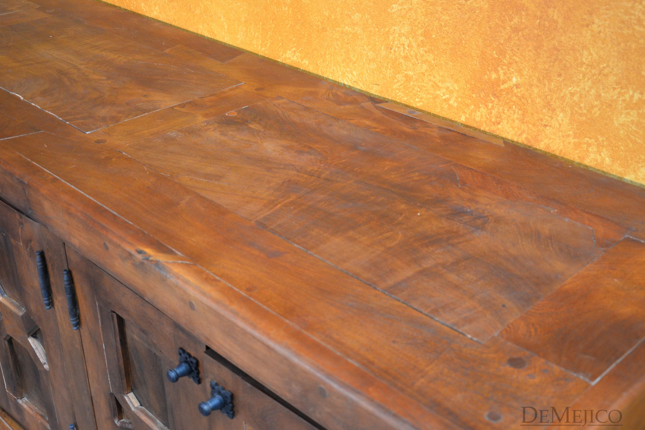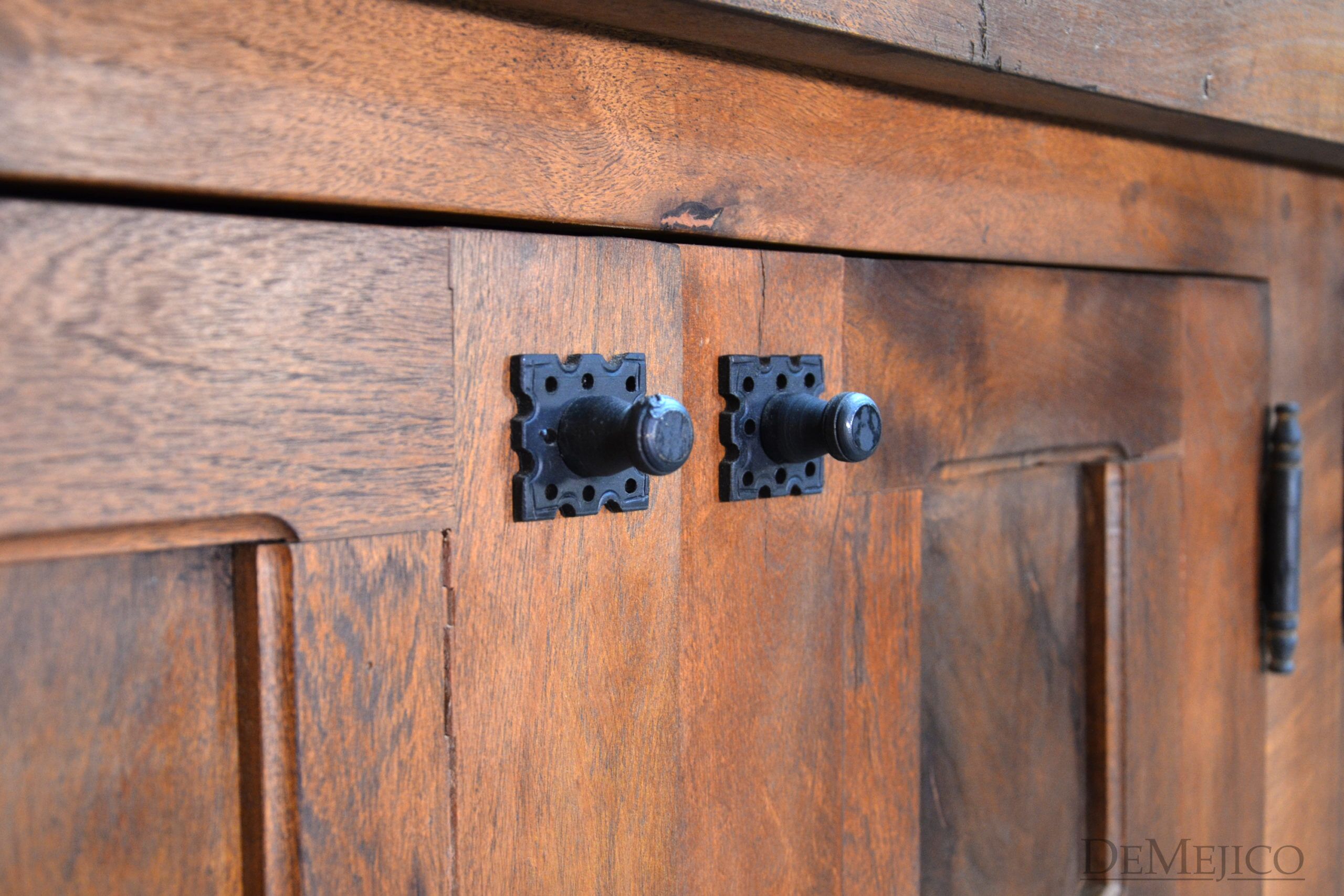 Brand new to our Living Room Catalog, the Eduardo Entertainment Center is a large piece, hand crafted from solid mesquite wood. Featuring unique cut outs throughout the three double door cabinets, the Eduardo Entertainment Center gives off a geometric feel, while still bringing in Spanish touches hand forged iron hardware and pulls. Finished off with a bold edge along the top and bottom, this carved entertainment center can be used in your living, dining, or entertaining space for an attention-grabbing touch and lots of storage.