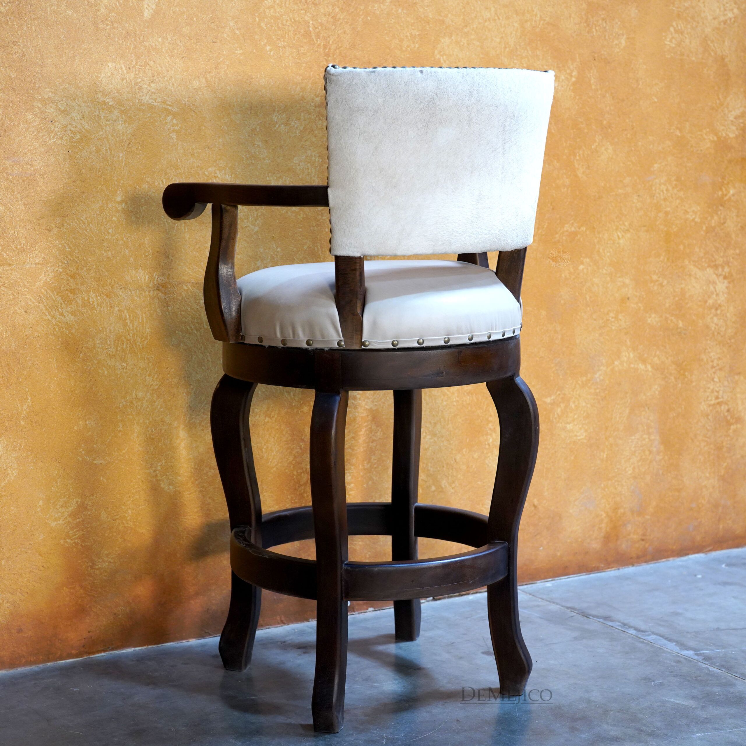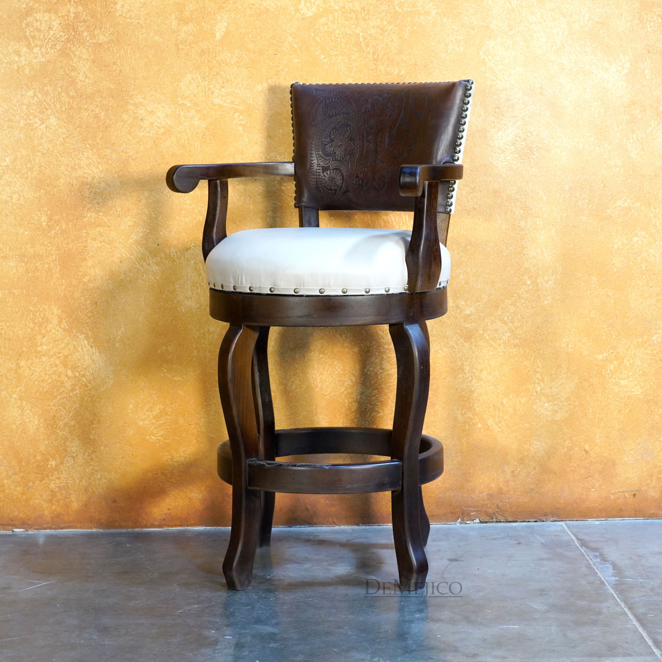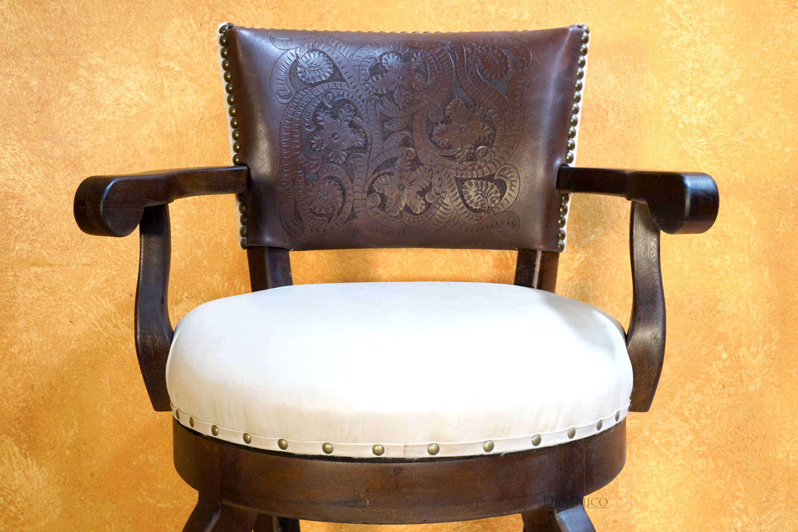 The Elegante Barstool Especial is a brand new version of our Elegante Barstool with Arms, but with an added tooled leather backrest. Built from solid pine wood, this contemporary stool features turned legs and an upholstered, vintage white leather seat for optimal style and comfort. Grabbing your attention, the backrest of this Western barstool features a hand tooled leather design on front and a smooth cowhide upholstery on the back. To give a final touch of Spanish design, hand pounded iron clavos have been added around the leather backing and seat. Add this vintage leather barstool to your kitchen or entertainment space for a Spanish Western touch.