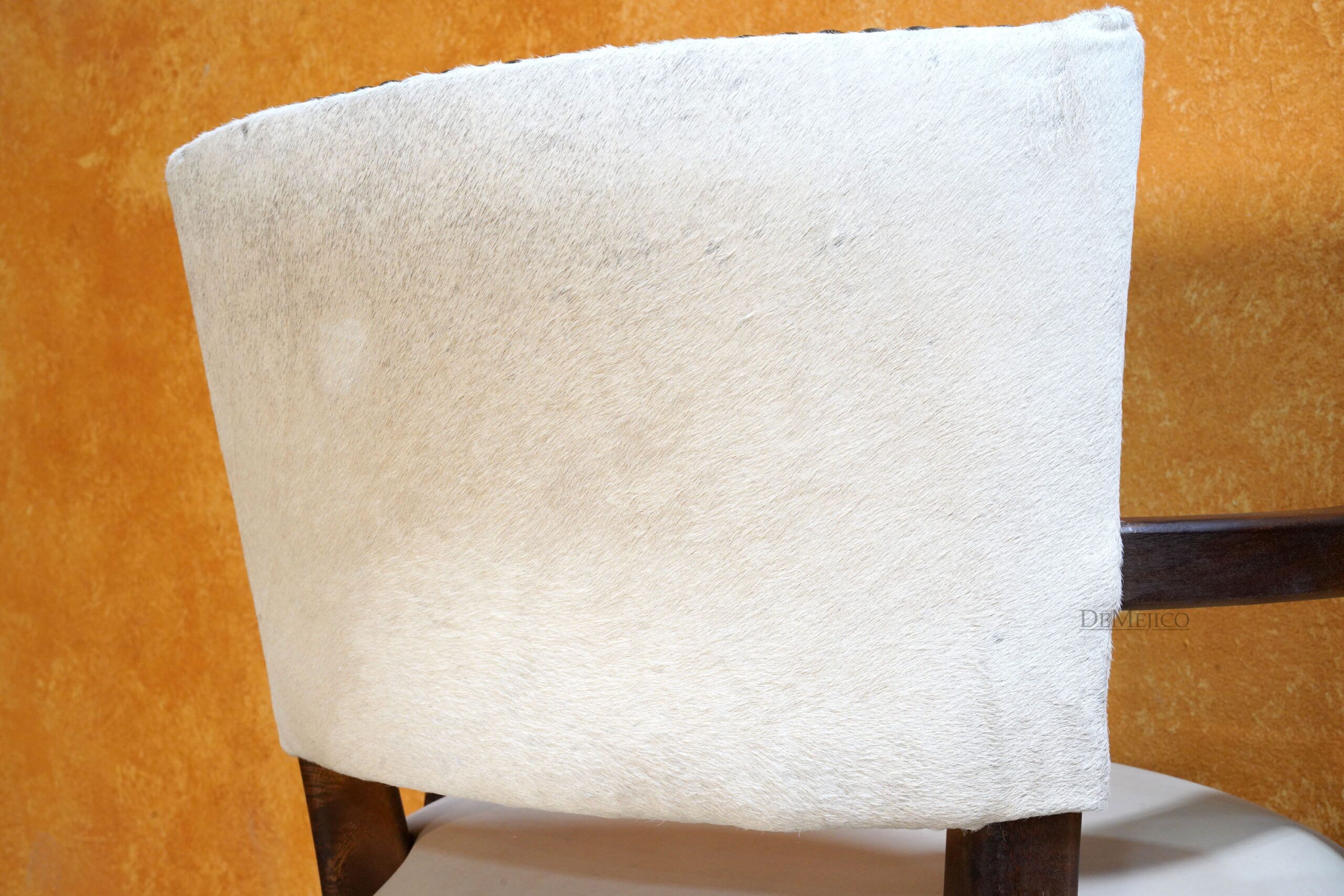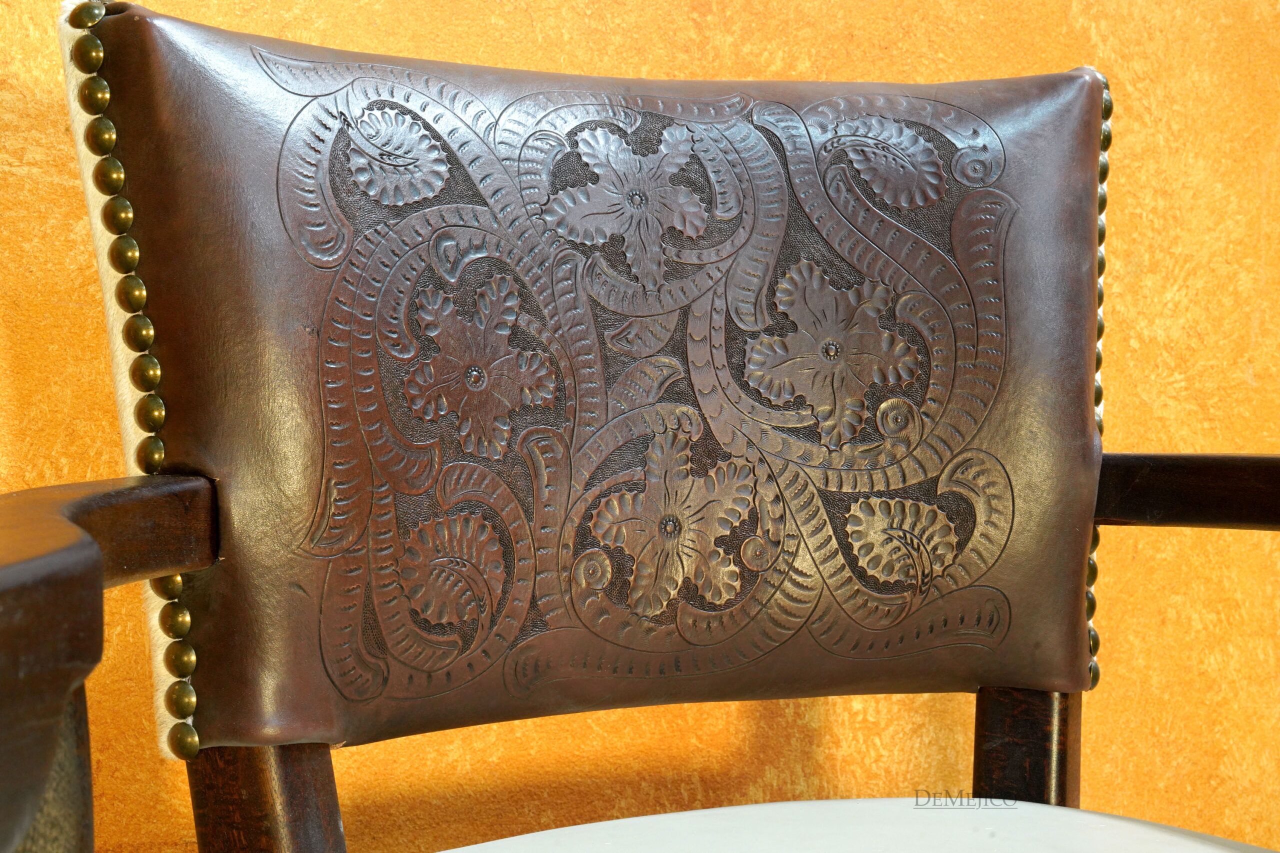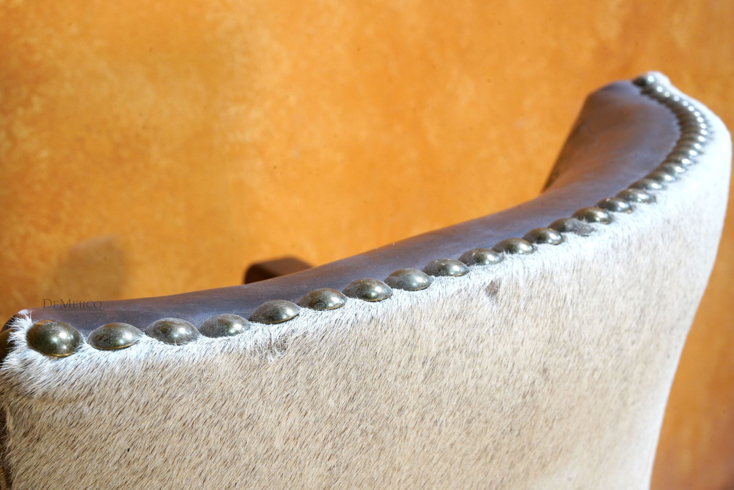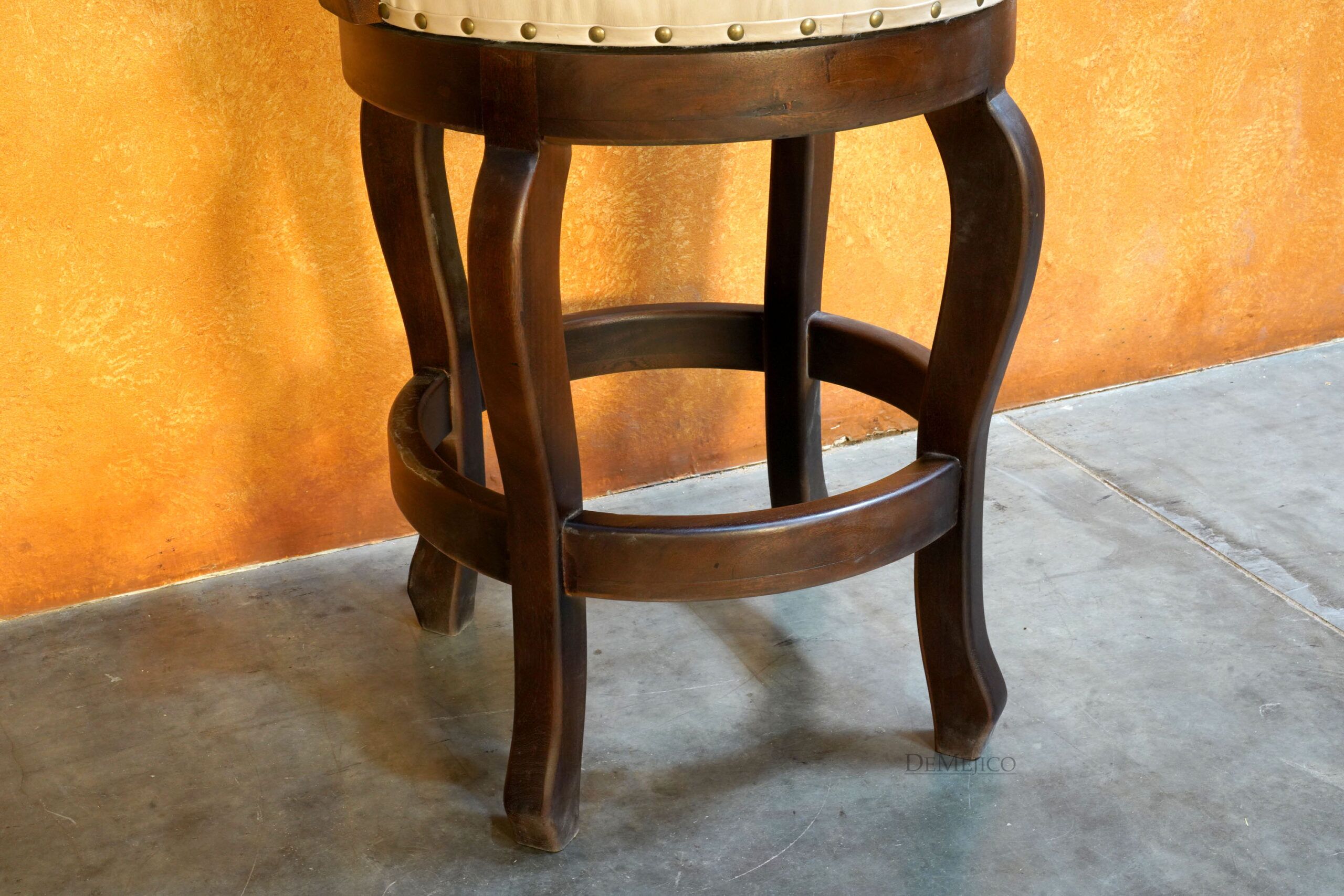 The Elegante Barstool Especial is a brand new version of our Elegante Barstool with Arms, but with an added tooled leather backrest. Built from solid pine wood, this contemporary stool features turned legs and an upholstered, vintage white leather seat for optimal style and comfort. Grabbing your attention, the backrest of this Western barstool features a hand tooled leather design on front and a smooth cowhide upholstery on the back. To give a final touch of Spanish design, hand pounded iron clavos have been added around the leather backing and seat. Add this vintage leather barstool to your kitchen or entertainment space for a Spanish Western touch.