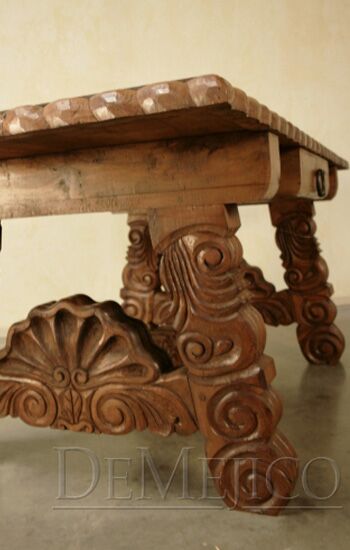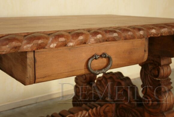 This beautiful mesquite carved desk features exquisite and extensive hand carving in a traditional Spanish concha motif. While the centered drawer features traditional joinery and hand-forged iron accents.