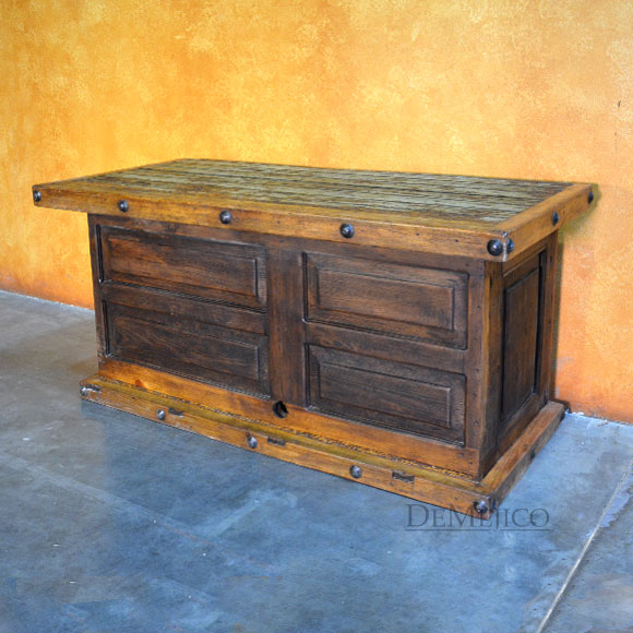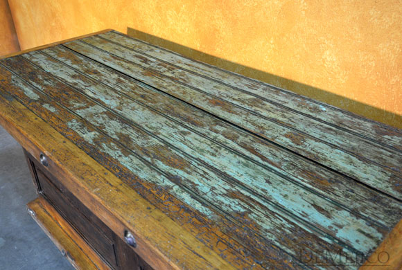 A new addition to our Office Catalog, the Escritorio Jalisco is a rustic desk, hand crafted from solid reclaimed wood and old doors. Grabbing your attention right away, the facing of this desk features a once functioning old door, with four offset raised panels. The top features beautiful planks of reclaimed wood that feature a beautiful blue-green Patina finish throughout. On the working side of this desk are two large drawers with even more bright blue Patina. Accented with hand pounded clavos around the edges, and hand forged hardware on the two drawers, the Escritorio Jalisco is a Spanish rustic desk with one-of-a-kind elements and style.