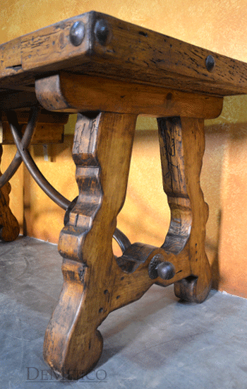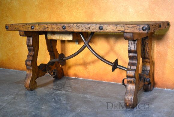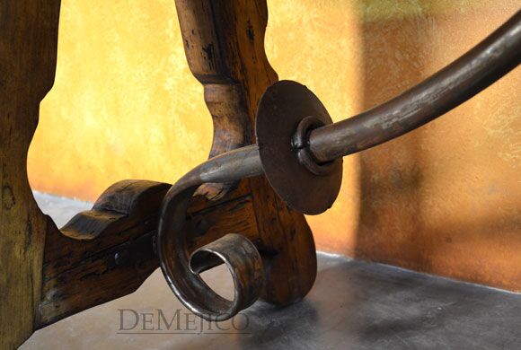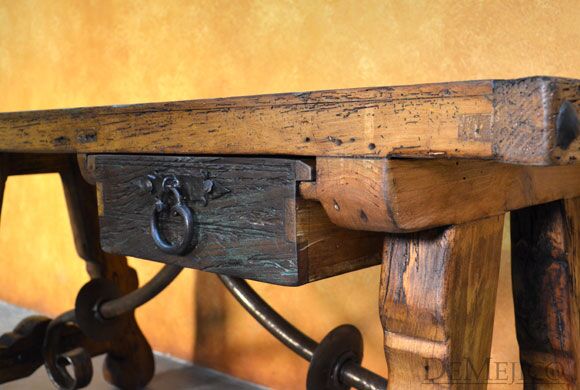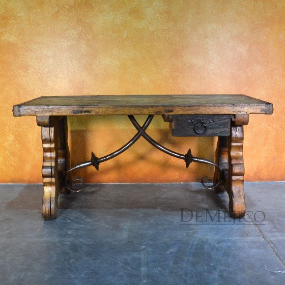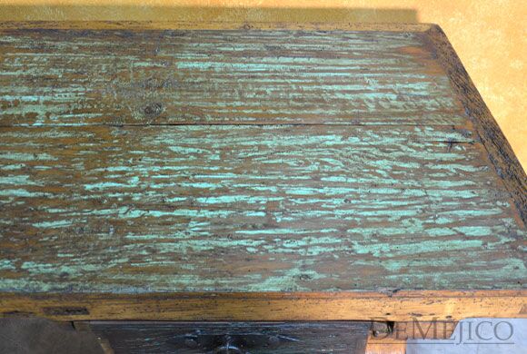 The Escritorio Yugos is a one-of-a-kind rustic old door desk, made from an original old door as well as reclaimed wood. From the original old door to the reclaimed wood, this door is filled with natural stretches, knots, and imperfections. Grabbing your attention right away are the thick, hand crafted legs along with a hand forged iron accent centerpiece. Surrounding the beautiful blue Patina old door top, large hand pounded clavos complete the look of this rustic desk.