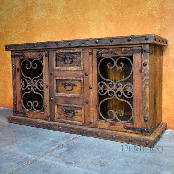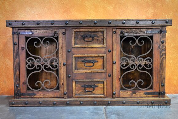 The Forged Espanola Wrought Iron Buffet Hutch exhibits a beautifully contrasting design with the use of hand-scrolled iron and solid old wood. The contrasting goes beyond the use of materials by contrasting the color of the honey stained wood to the naturally rusted iron scrolls. This Espanola Buffet a versatile piece with the use of ball-bearing railed drawers and built-in sheves on each side, making it a perfect accent piece. Ask us how we can tailor the Espanola Buffet to fit your storage and design needs.