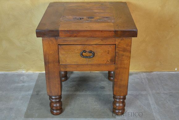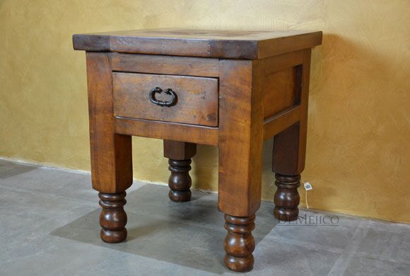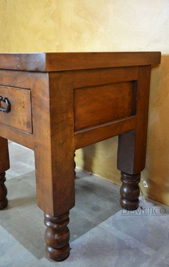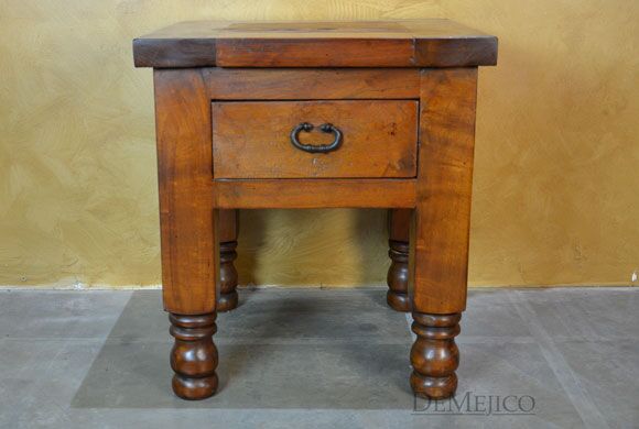 The Hacienda Torno End Table is a simple end table featured in our Living Room Catalog. Built from solid mesquite wood, this end table features a smooth top that beautifully showcases all of the wood’s natural knots, stretches, and movements. The sides of this end table feature raised paneling, while the front features a single drawer, accented by a hand forged iron hardware pull. Grabbing your attention, the final details of this end table are the turned legs bottoms, taking inspiration from our many other Torno styled pieces.
