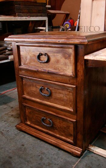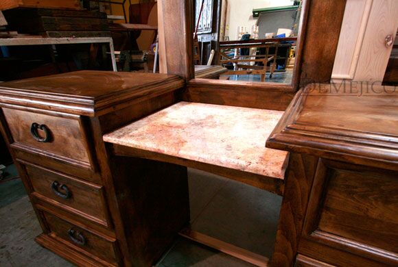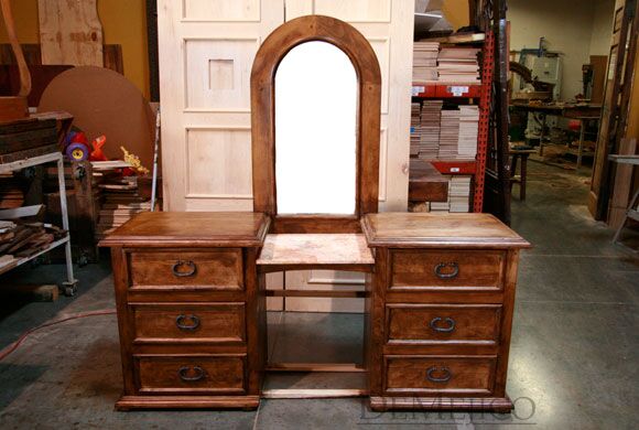 A classic addition to our Vanity Catalog, the Hacienda Vanity brings in a touch of Spanish style, while giving off a simple look. Made from solid mesquite wood, this vanity features two cabinets on either side of a unique center piece. This centerpiece features a Spanish arched mirror, paired with a travertine stone countertop. For a great deal of storage space, the two cabinets each feature three large drawers that have been accented with hand forged iron hardware pulls. This vanity’s Spanish style is enhanced through the smooth tops which showcase the natural grains and stretches of the wood, as well as through the subtly beveled edges. Add this Spanish style vanity to your bedroom space for a classic touch.