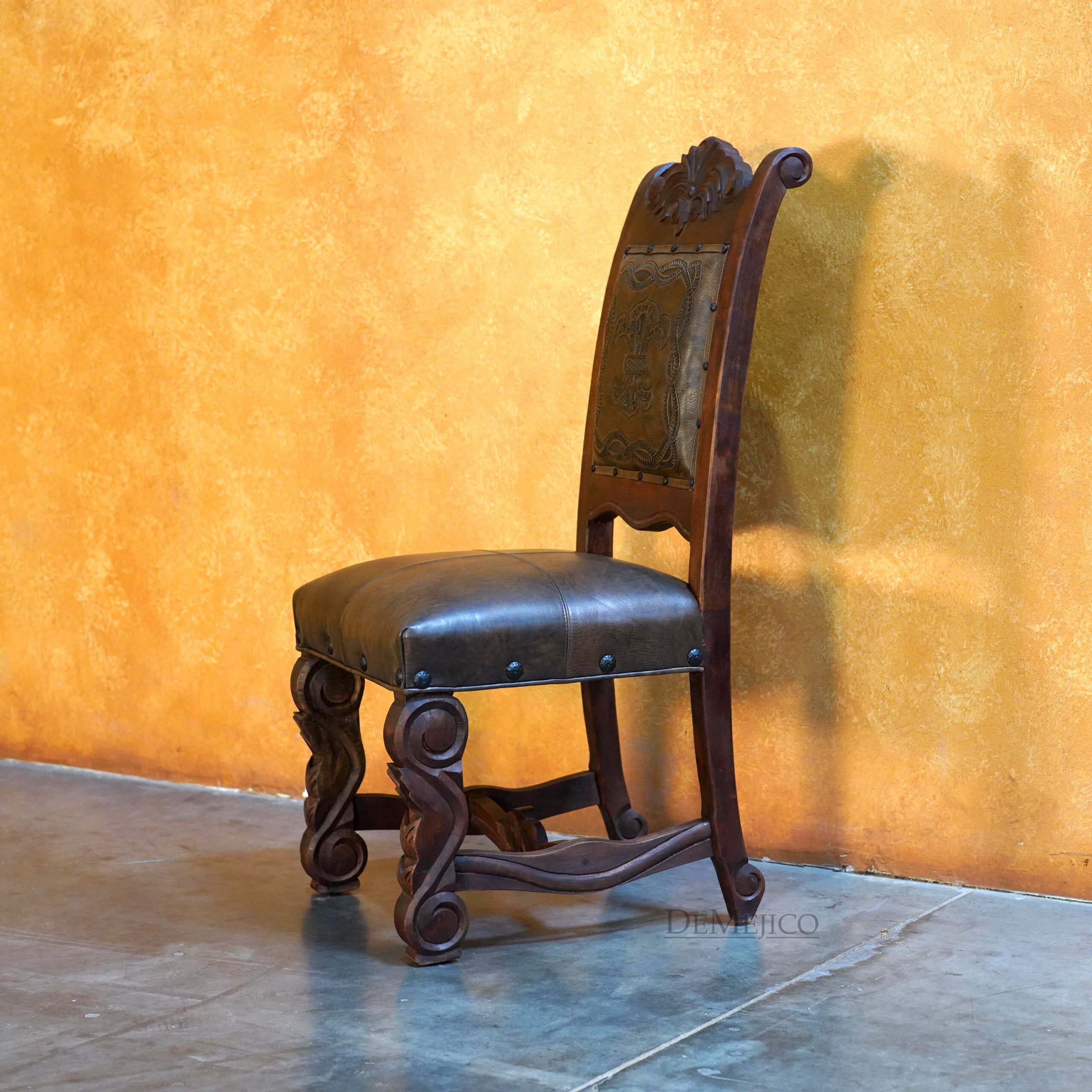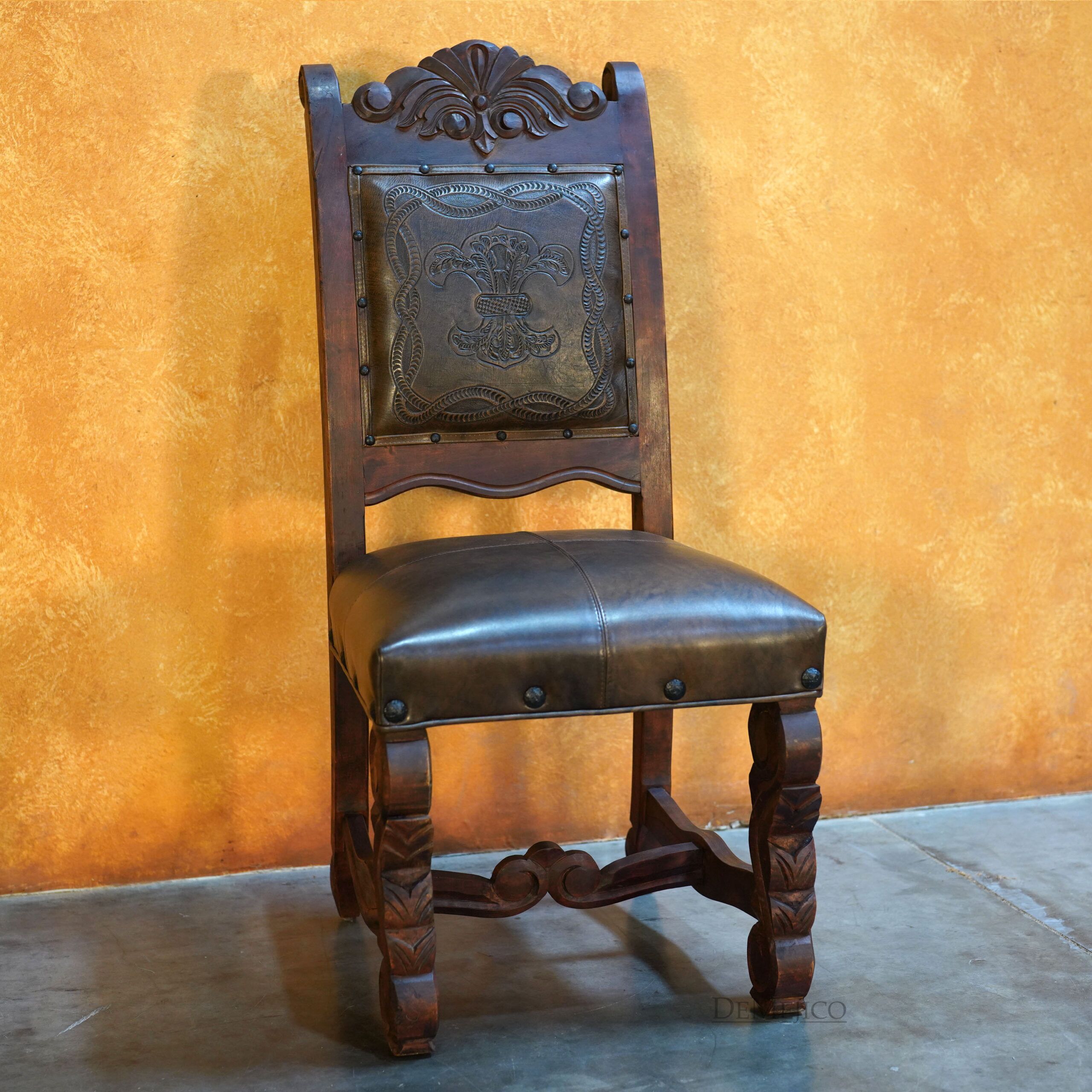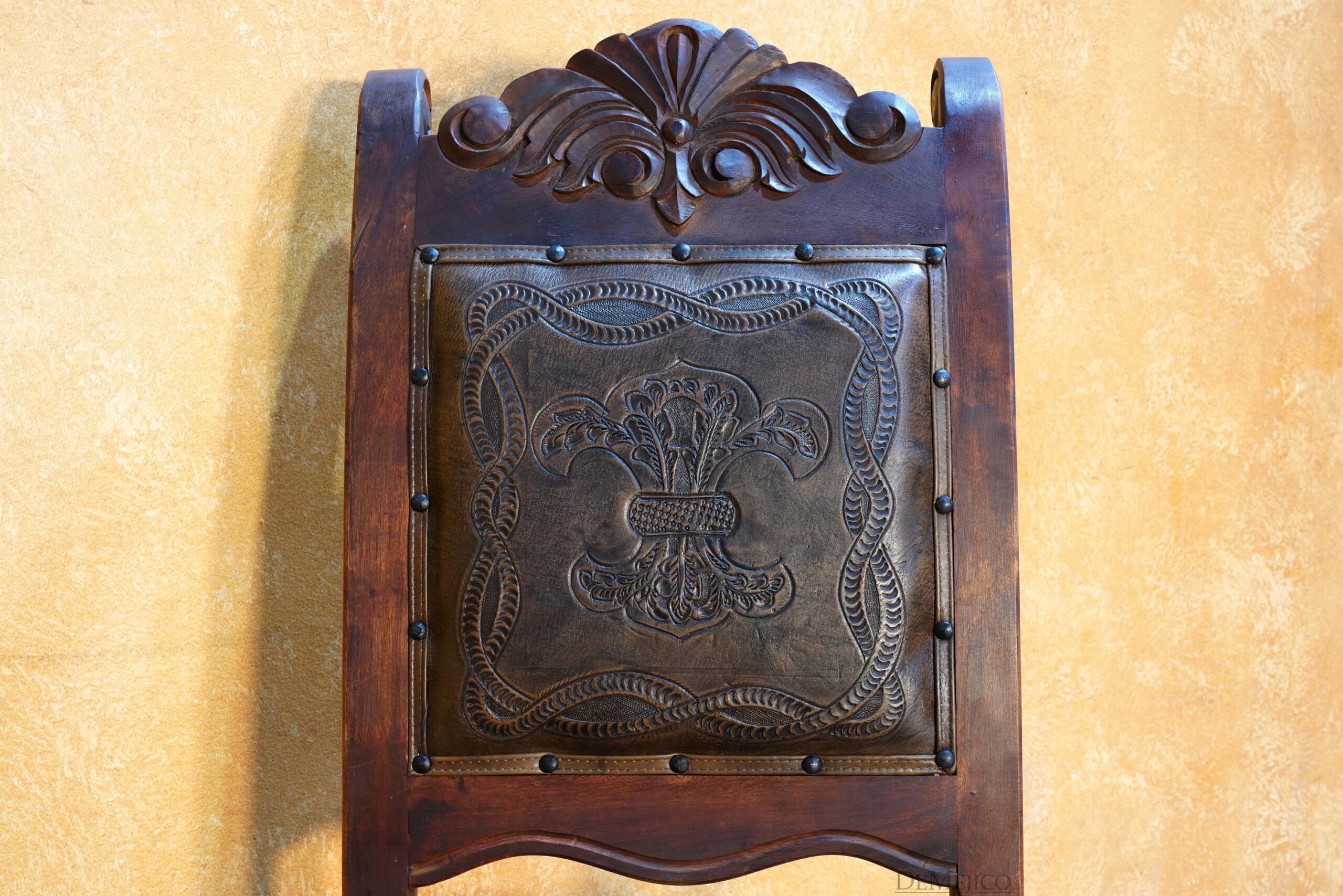 Our Classic Hoja Carved tooled leather chair design is beautifully carved from carefully selected mesquite wood and upholstered with a soft vintage leather. The hand-tooled Fleur-de-lis design of the back enhances the classic beauty of the Hoja Carved Chair with a unique twist. This specially made Hoja Chair finishes off with a hand-stitched seating pounded with iron clavo accents.