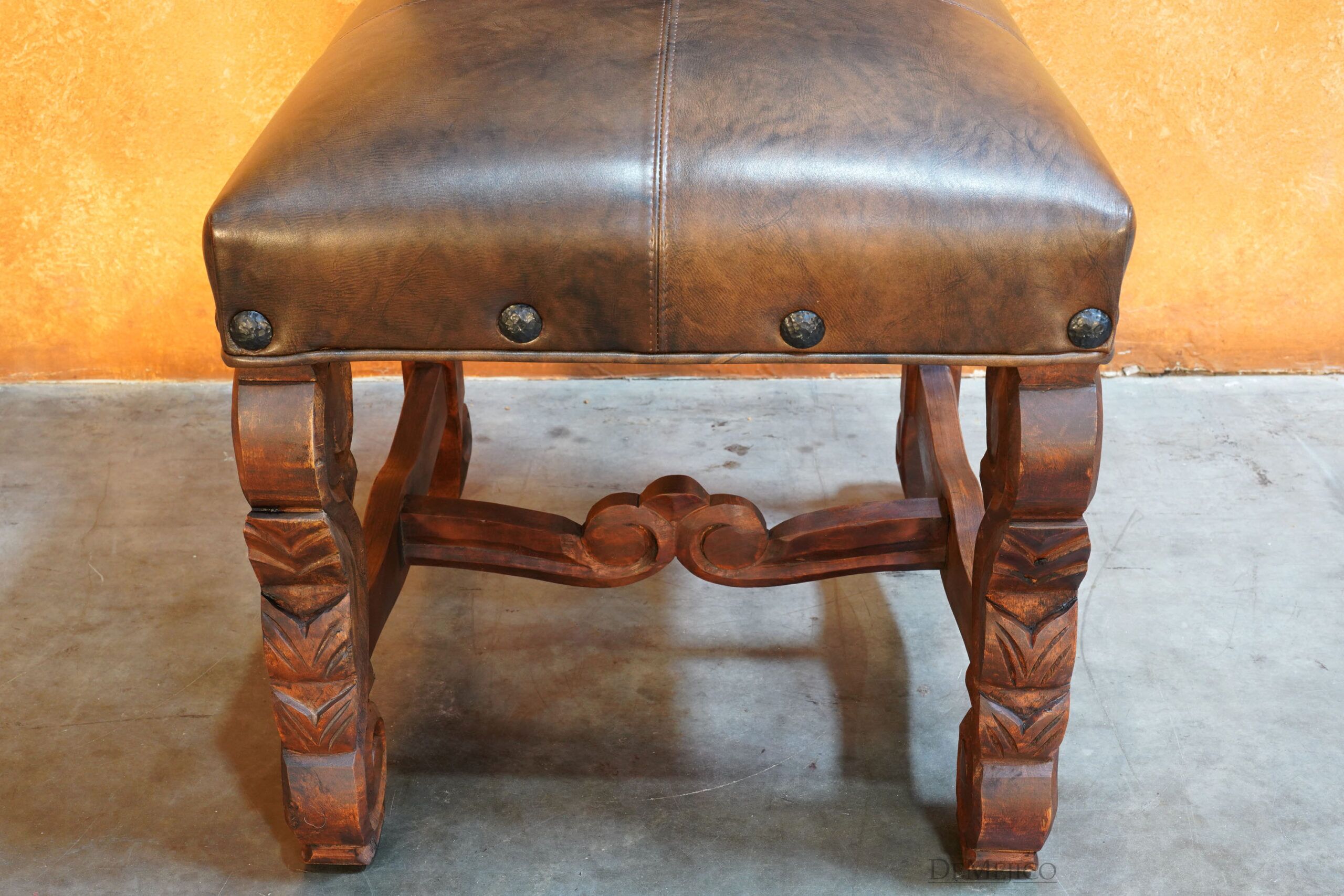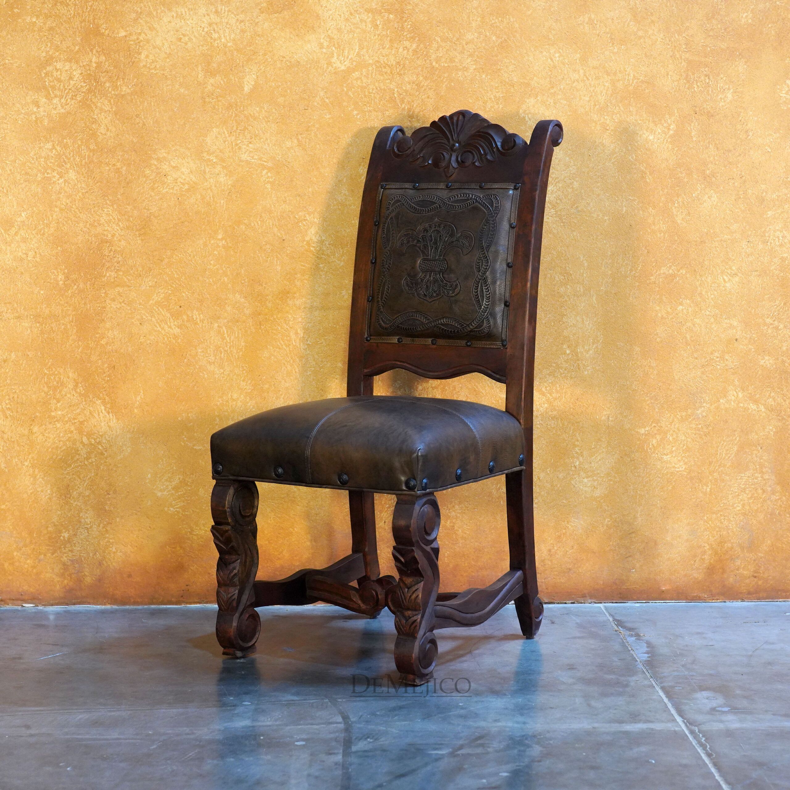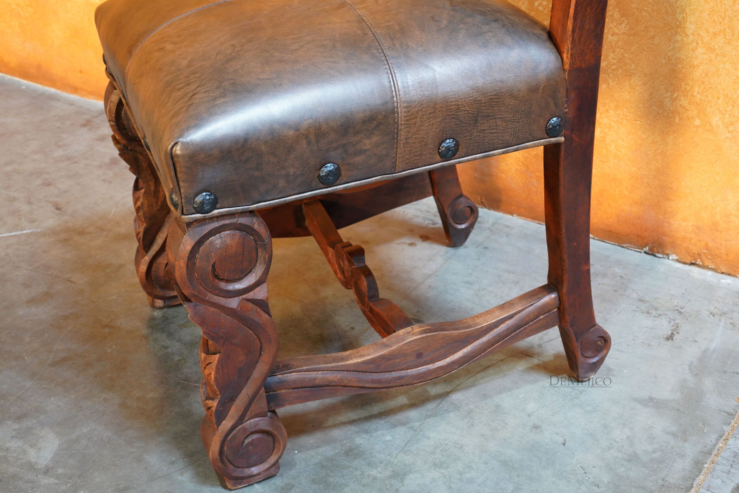 Our Classic Hoja Carved tooled leather chair design is beautifully carved from carefully selected mesquite wood and upholstered with a soft vintage leather. The hand-tooled Fleur-de-lis design of the back enhances the classic beauty of the Hoja Carved Chair with a unique twist. This specially made Hoja Chair finishes off with a hand-stitched seating pounded with iron clavo accents.