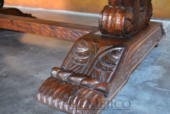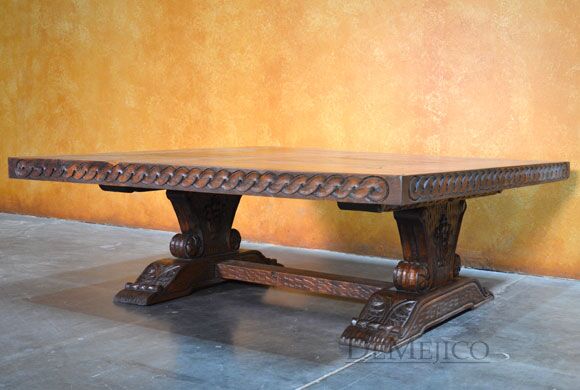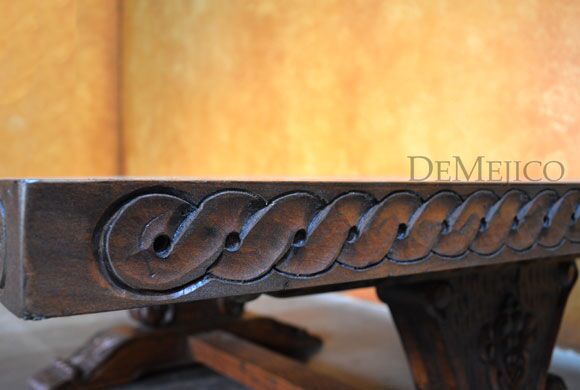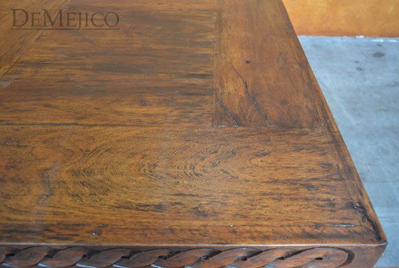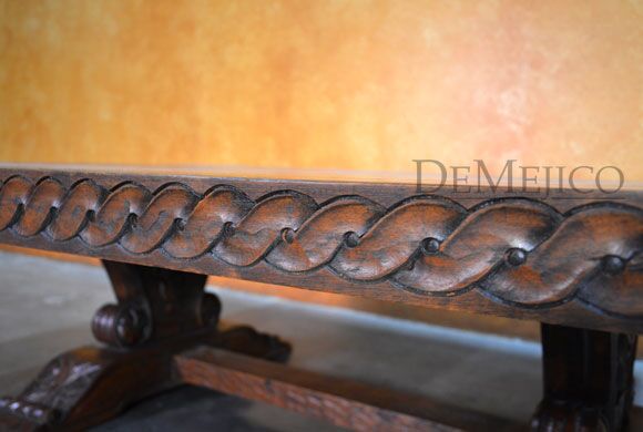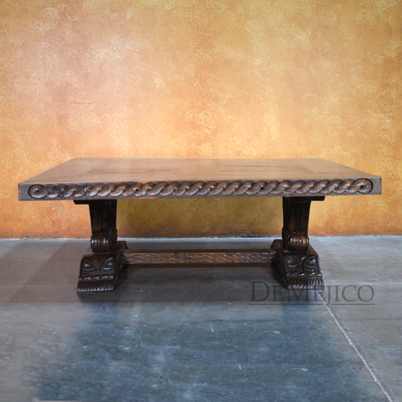 The Armida Coffee Table is a stunning Spanish coffee table featured in our Living Room Catalog. Inspired by our Armida style dining tables, this coffee table is made from solid aged mesquite wood, and features the same hand carved legs and trestle base, paired with a rope carved edge. With a smooth and thick top, this carved coffee table showcases the natural knots, stretches and movements of the mesquite wood. The attention to detail featured on the Armida Coffee Table will bring an authentic Spanish touch to any living room or entertainment space.