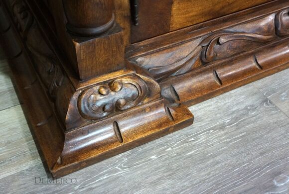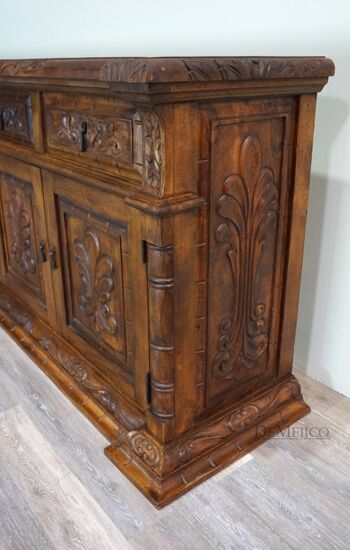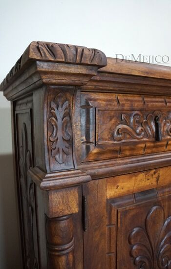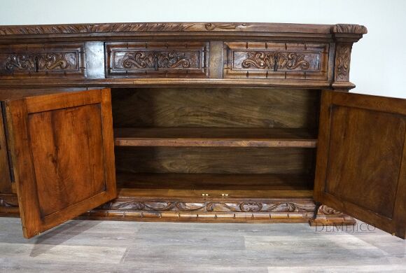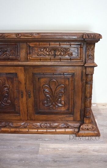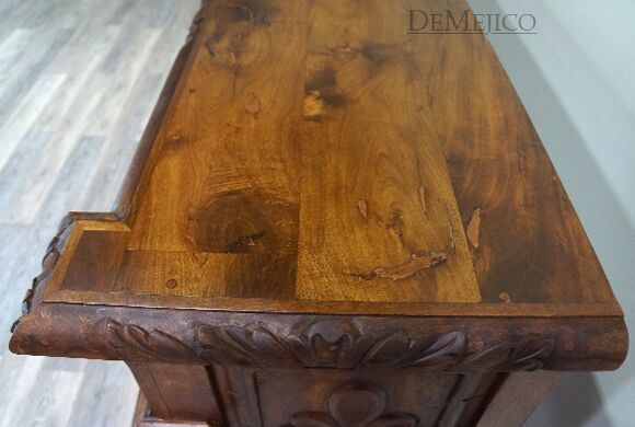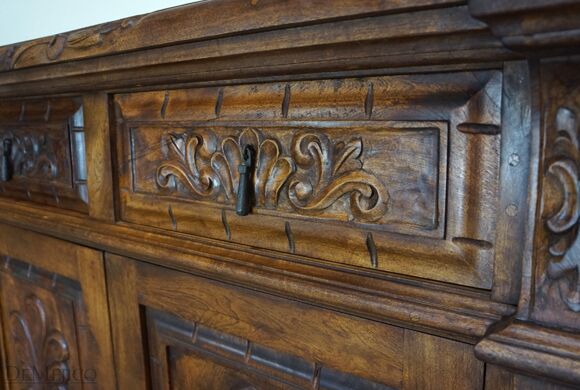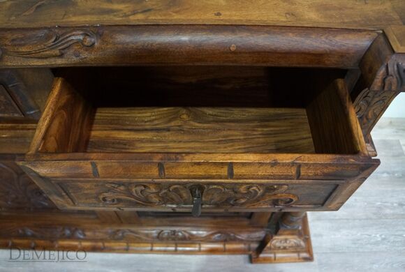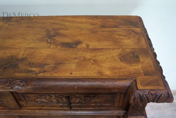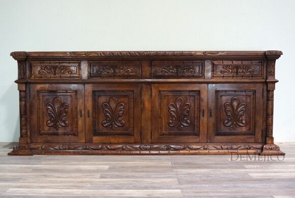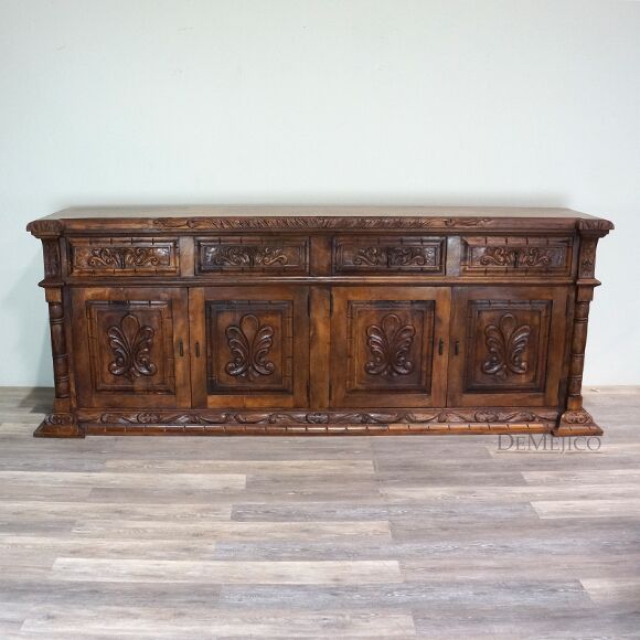 The Large Carmel Buffet is inspired by our Carmel Tuscan Buffet Table. Made from solid aged mesquite wood. It is complete with beautiful hand carved designs and iron hardware. With four drawers and four cabinets, this buffet table can function as an entertainment piece or even storage.